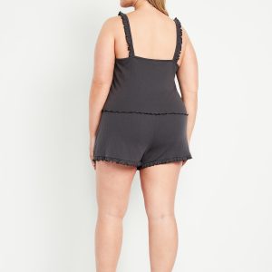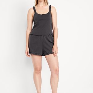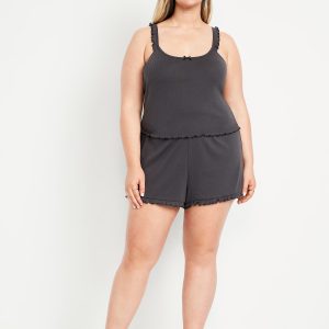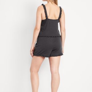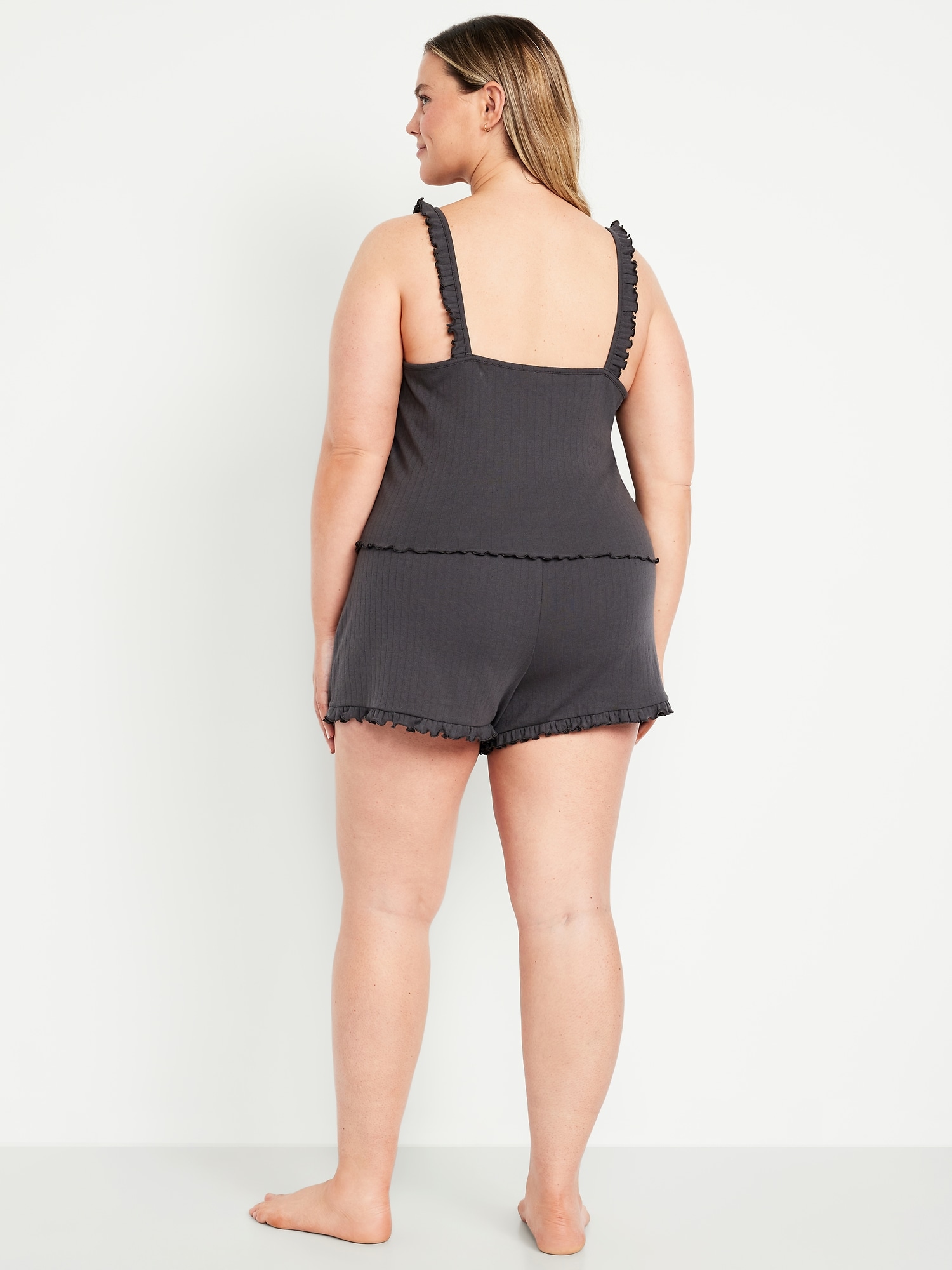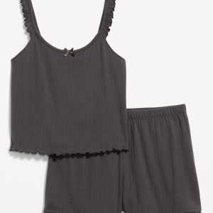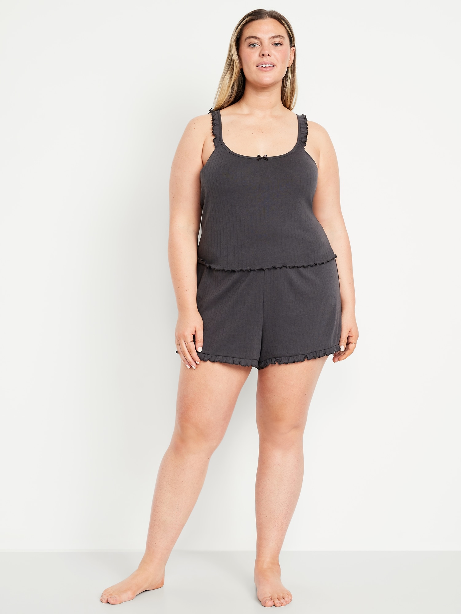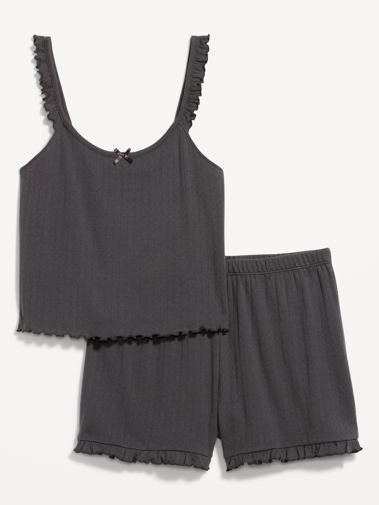 Pointelle Pajama Short Set: set includes cami sleep top and matching shorts, scoop neck with bow accent, ruffled straps, elastic-waist shorts with ruffled hem, #808329