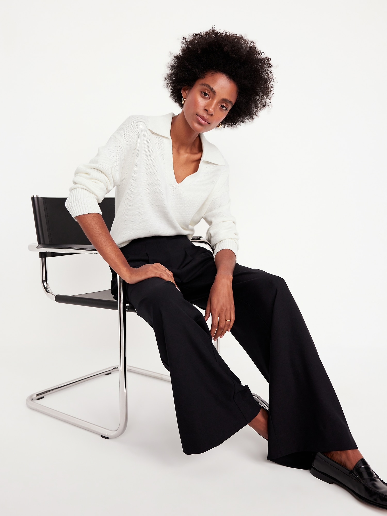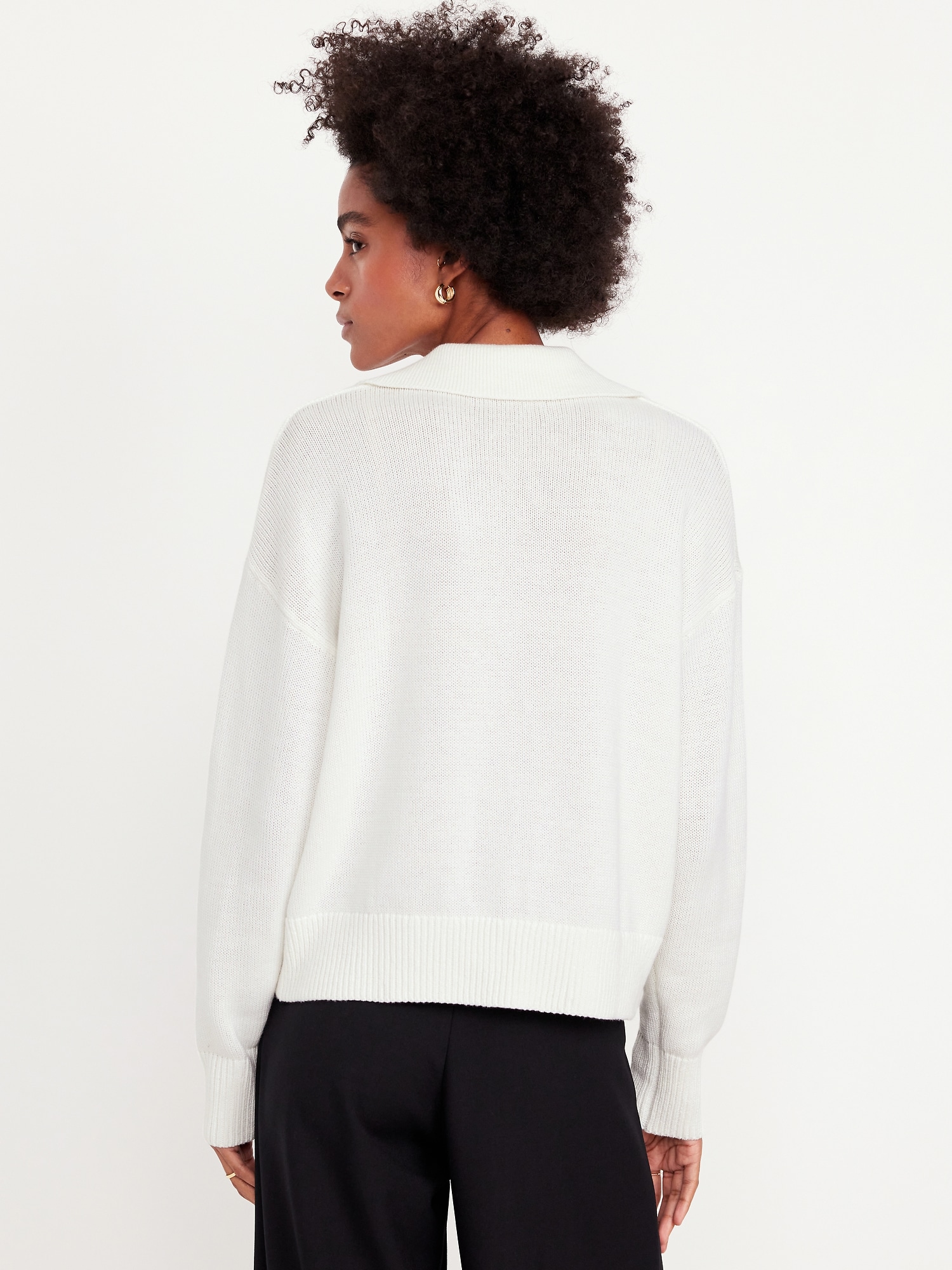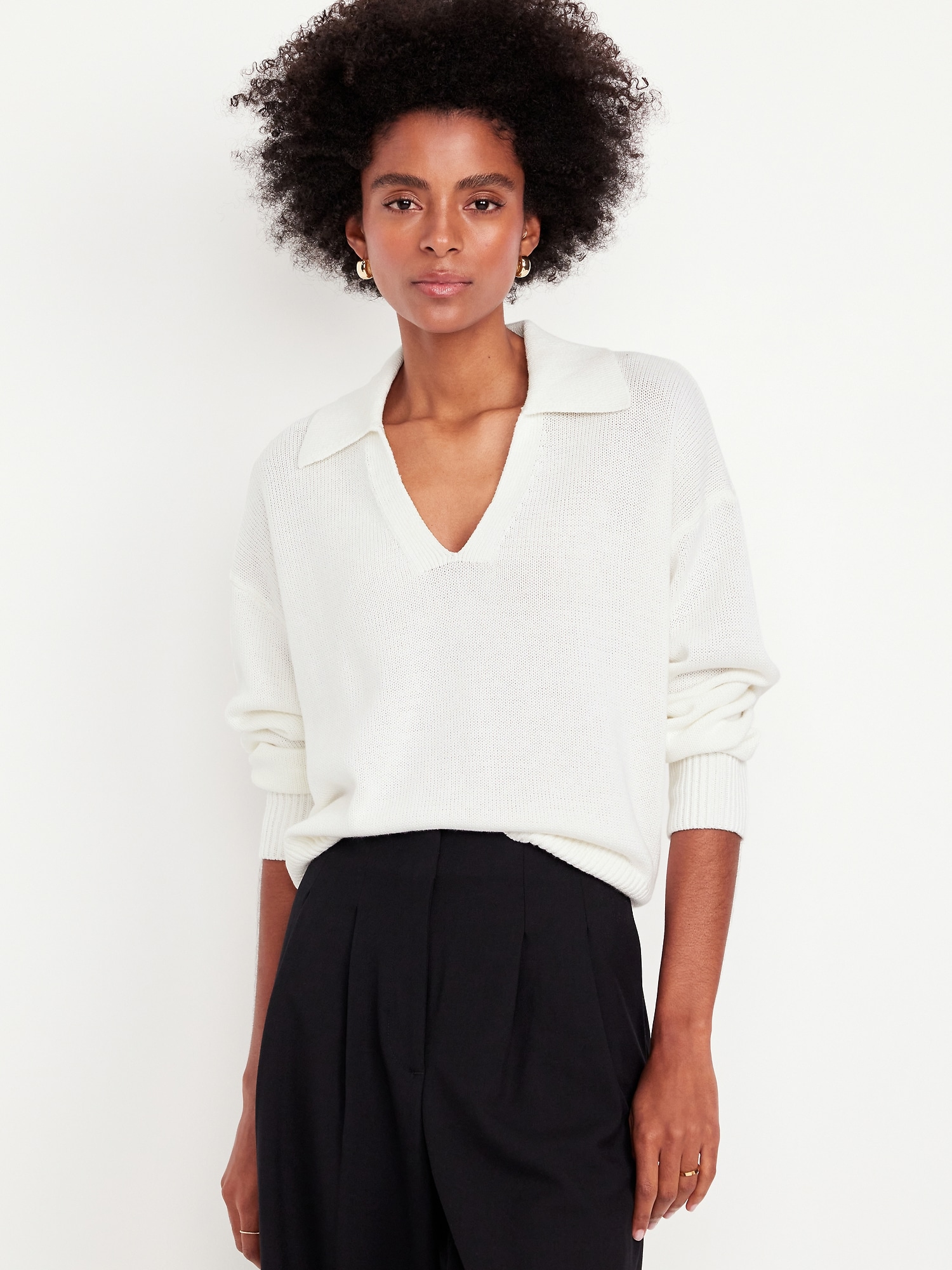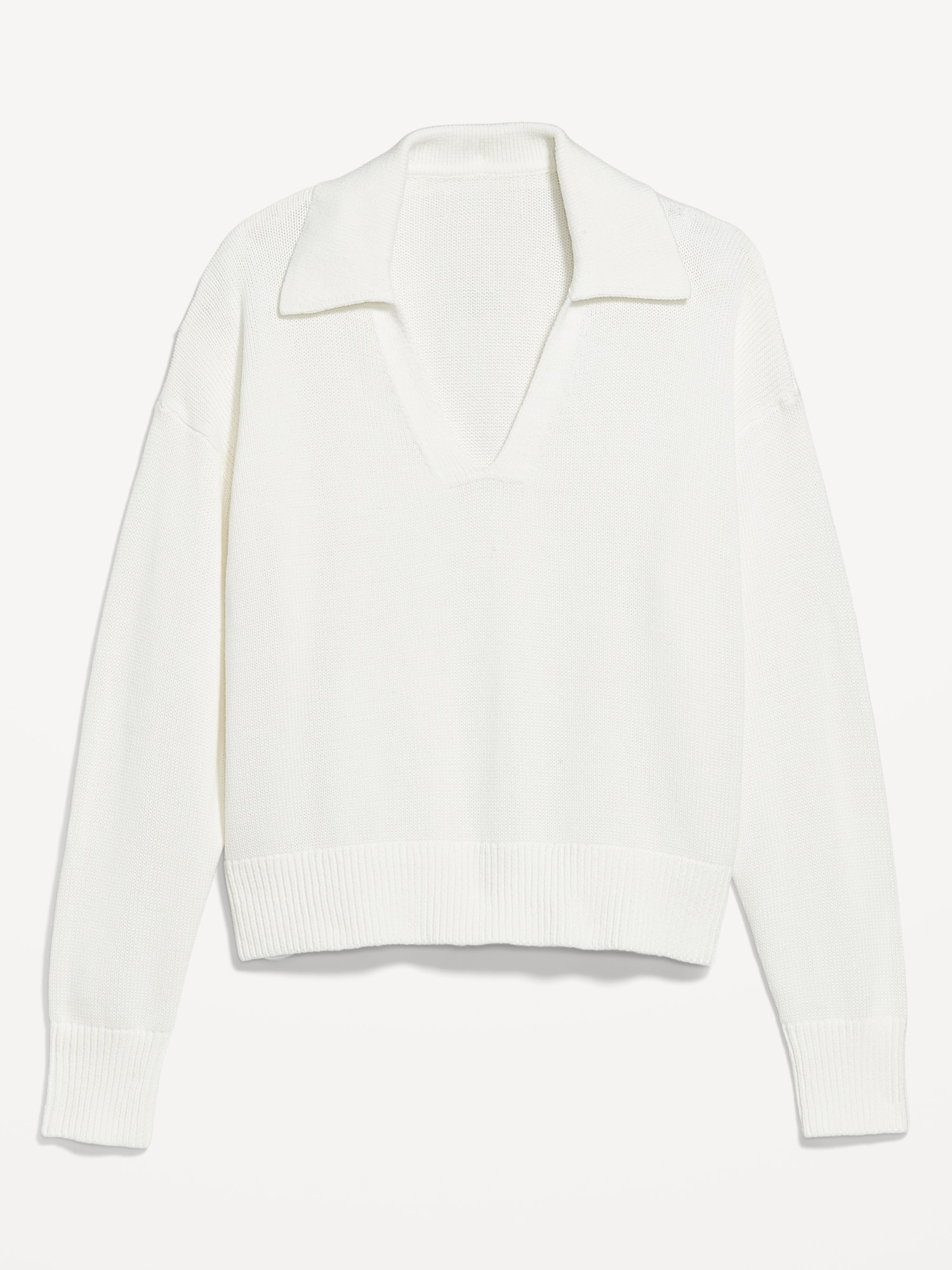 Polo Sweater: spread v-neck collar, long sleeves, rib-knit trim, curved hi-lo hem, pullover style, #576850