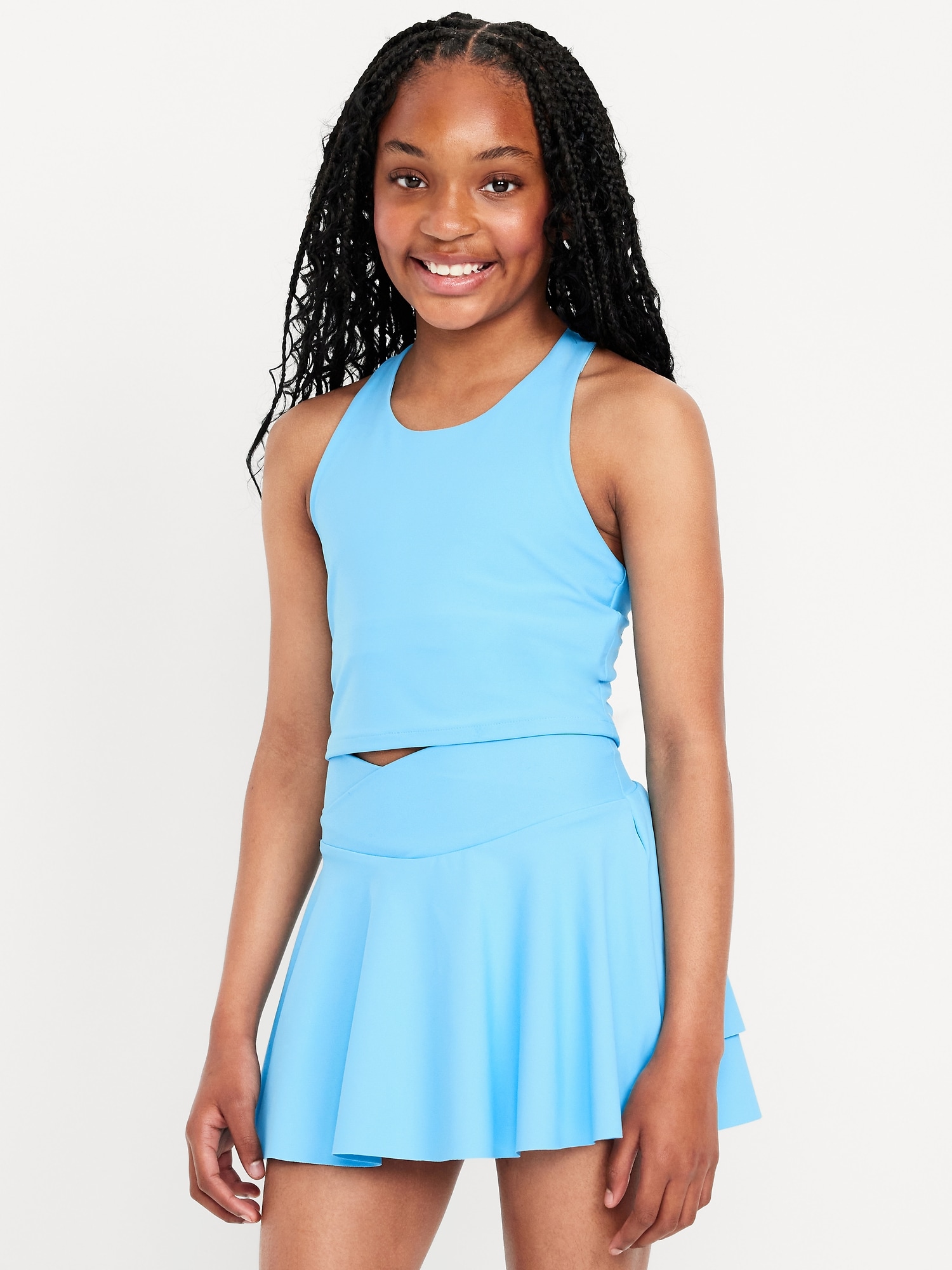 PowerSoft Longline Sports Bra for Girls: Made to keep up with all their shenanigans.scoop neck, wide shoulder straps, built-in shelf bra, elastic banded hem, #763215