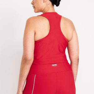 PowerSoft Racerback Cropped Shell Tank: Featuring PowerSoft. Light compression meets a peachy-smooth, sweat-wicking fabric.scoop neck, wide straps, racerback, contrasting piping, go-dry wicks moisture, #749263