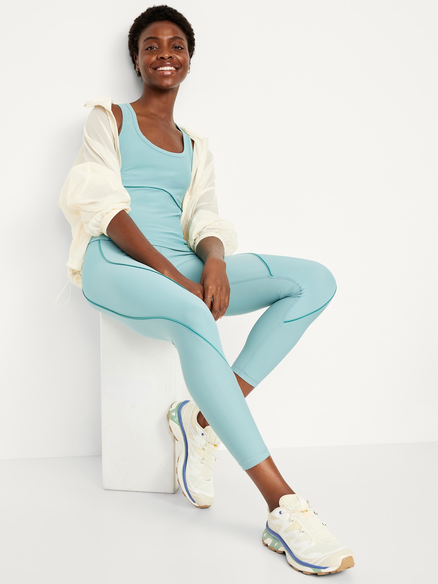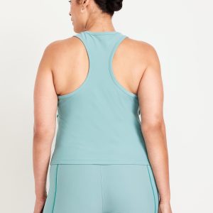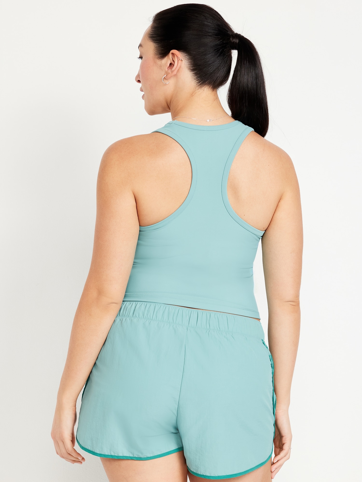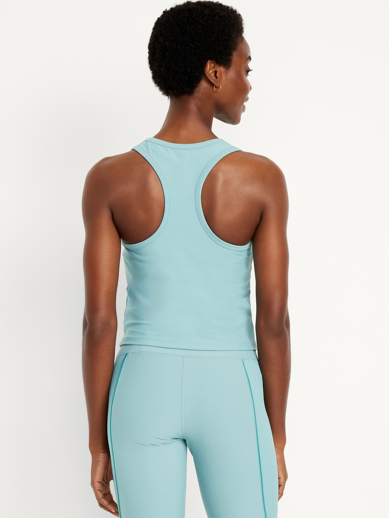 PowerSoft Racerback Cropped Shell Tank: Featuring PowerSoft. Light compression meets a peachy-smooth, sweat-wicking fabric.scoop neck, wide straps, racerback, contrasting piping, go-dry wicks moisture, #749263