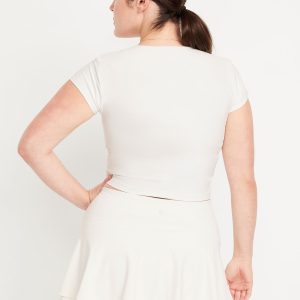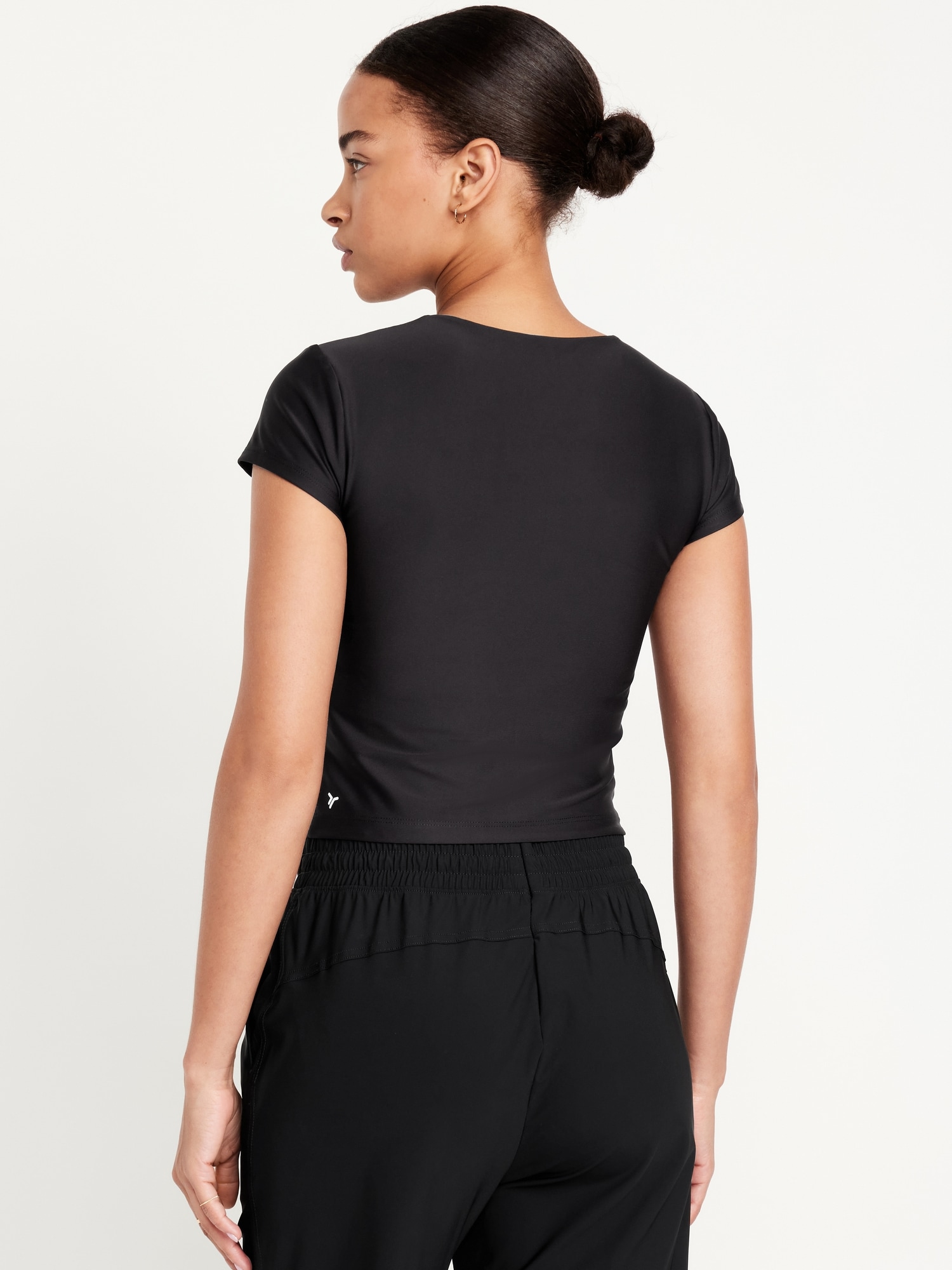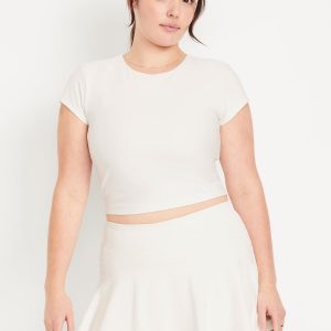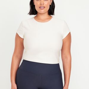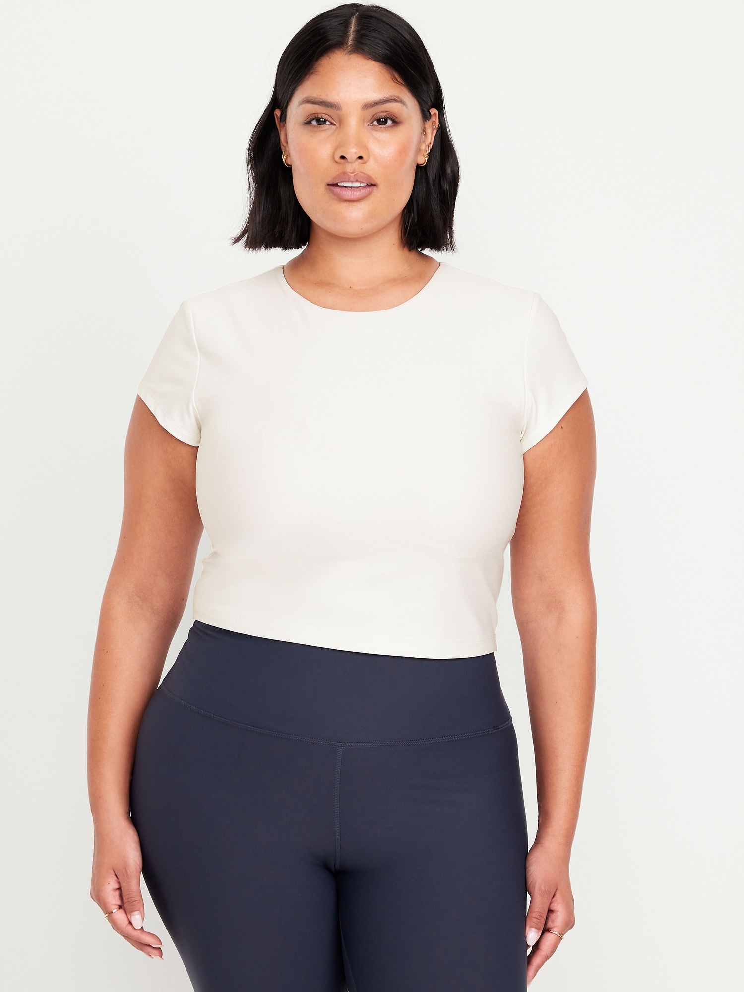PowerSoft Support Crop Top: Featuring PowerSoft. Light compression meets a peachy-smooth, sweat-wicking fabric.crew neck, cap sleeves, removable pads, go-dry wicks moisture, #484464