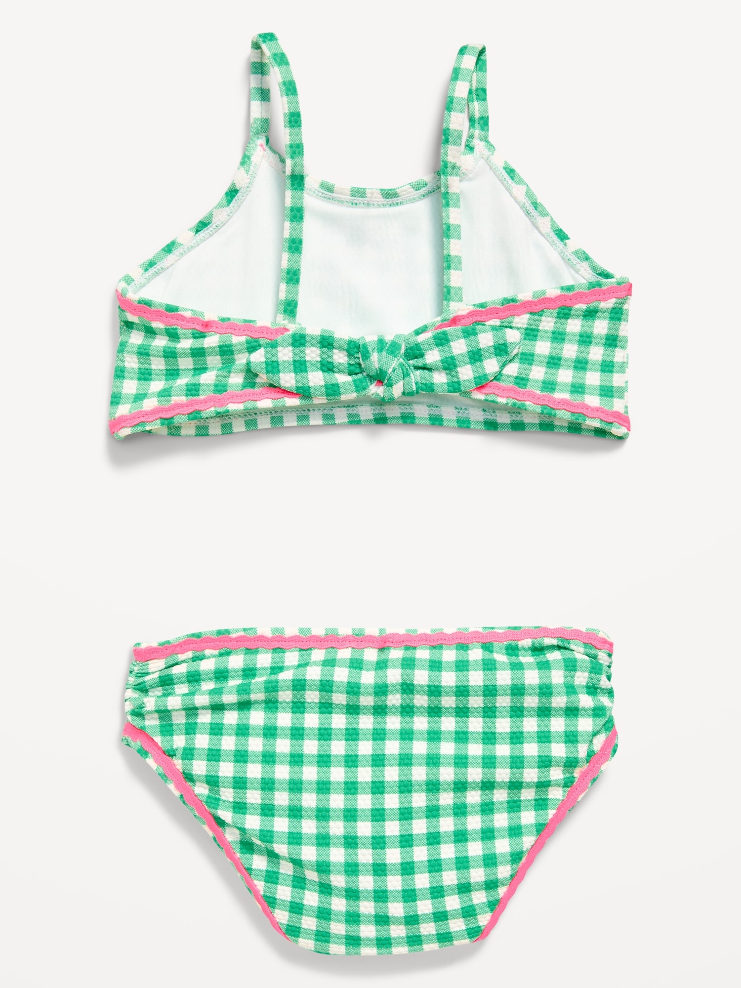 Printed Bikini Swim Set for Toddler & Baby: rounded neckline, thin straps, decorative crossover tie at back, matching bikini swim bottoms, all-over print, contrasting zig zag trim, #762436