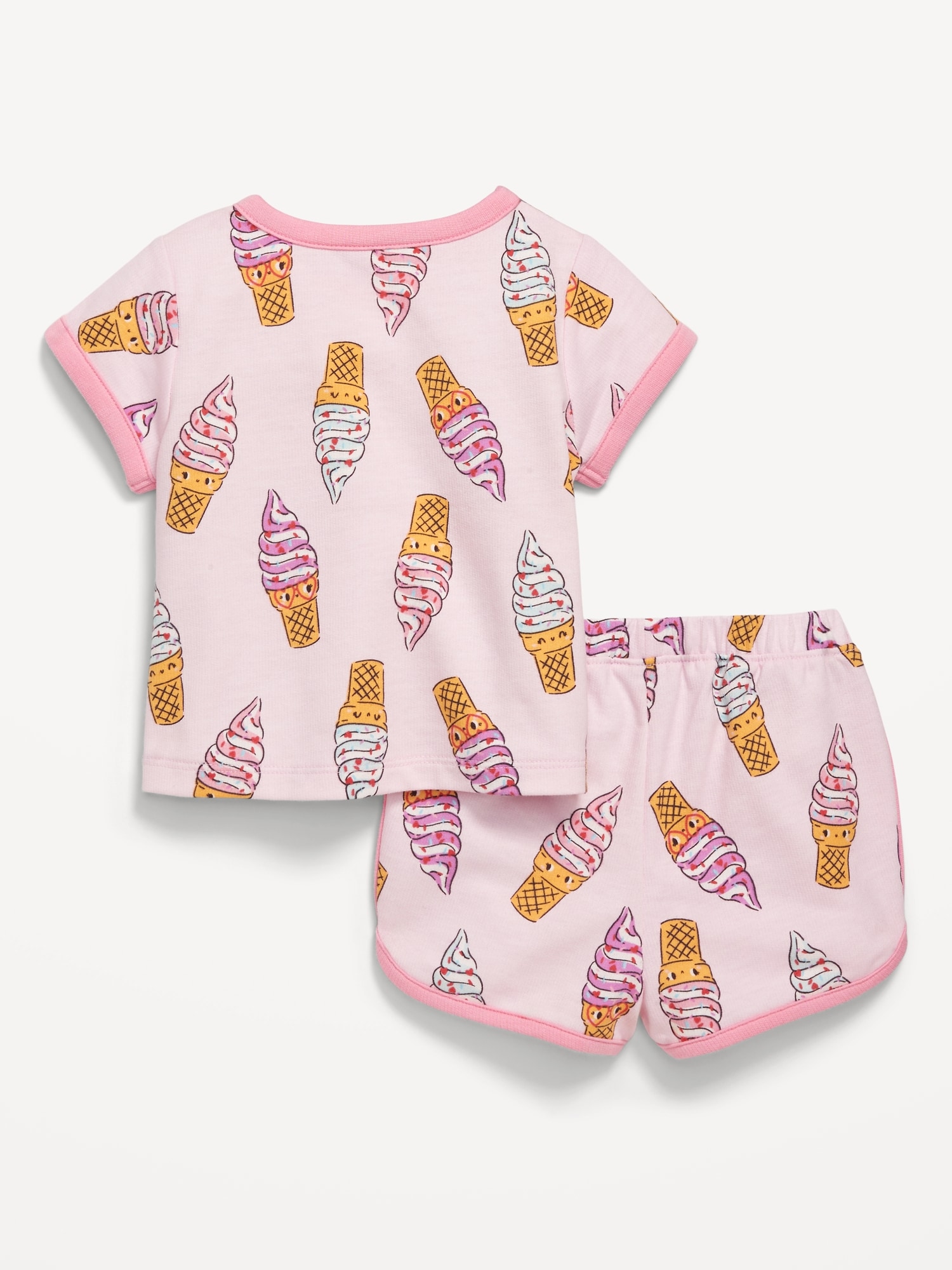 Printed French-Terry Ringer T-Shirt and Shorts Set for Baby: crew neck with buttons at shoulder, dolman sleeves, front graphic, functional elastic-drawstring waist shorts, available exclusively online and at old navy outlets, #766737
