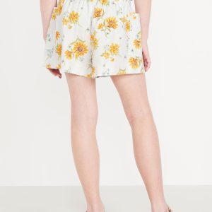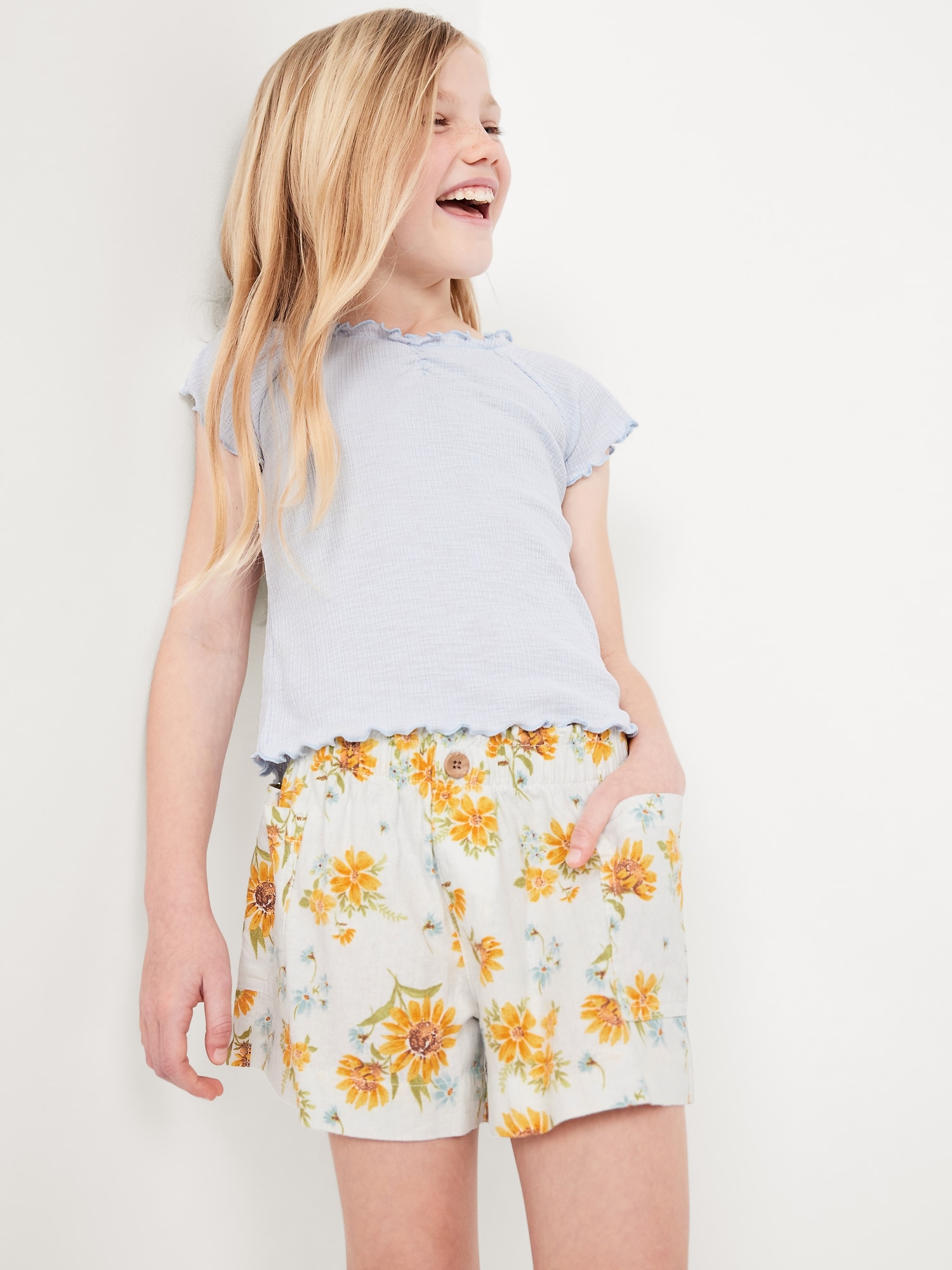 Printed Linen-Blend Utility Shorts for Girls: elasticized waistband, decorative button front, utility patch pockets at each side, all-over print, #767129