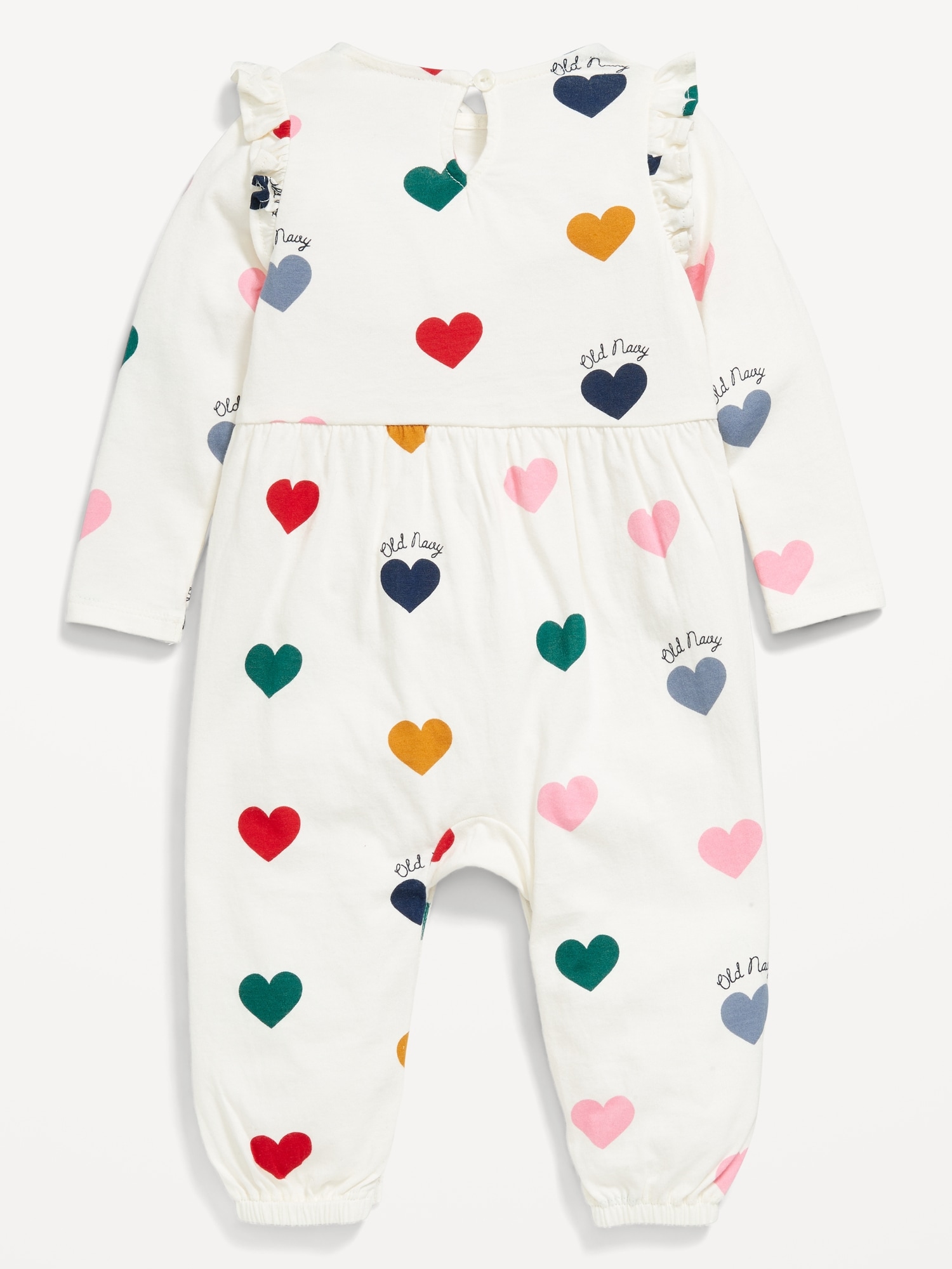 Printed Long-Sleeve Logo-Graphic Jumpsuit for Baby: round neckline, long sleeves, keyhole cutout at nape, ruffle trim along shoulders, seamed waist, hidden snaps at inseam, all-over logo graphic, available exclusively online and at old navy outlet stores., #806244
