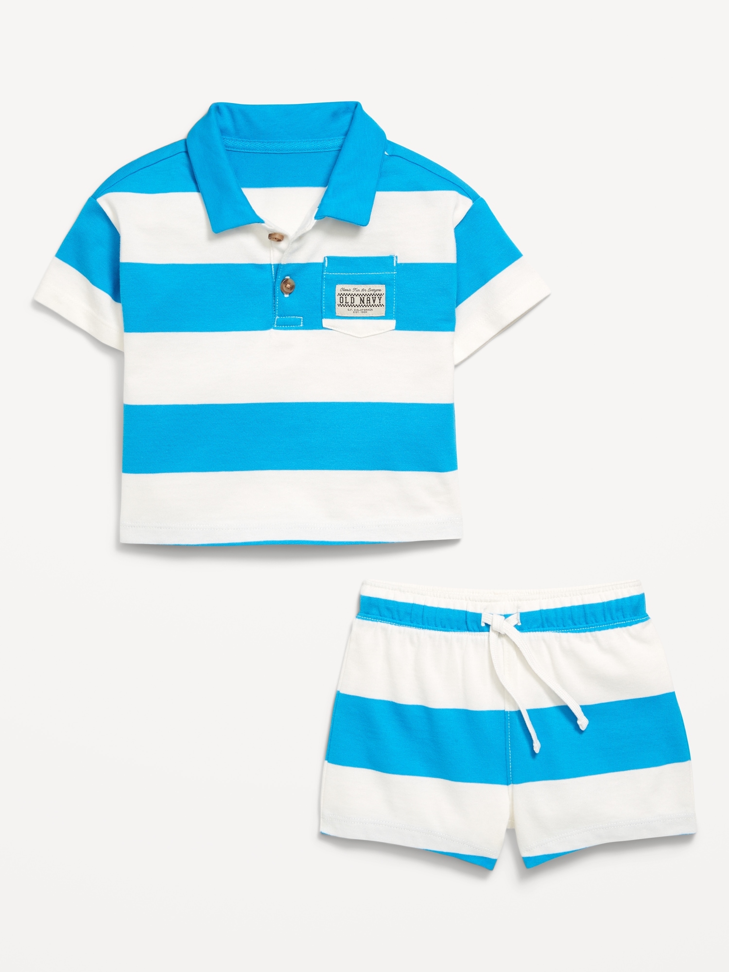 Printed Polo Shirt and Shorts Set for Baby: spread collar, two-button placket, short sleeves, drop shoulders, patch pocket at chest, small-scale embroidered logo patch at pocket, matching shorts, elasticized waistband, functional drawstring, all-over wide stripes, #761912