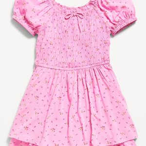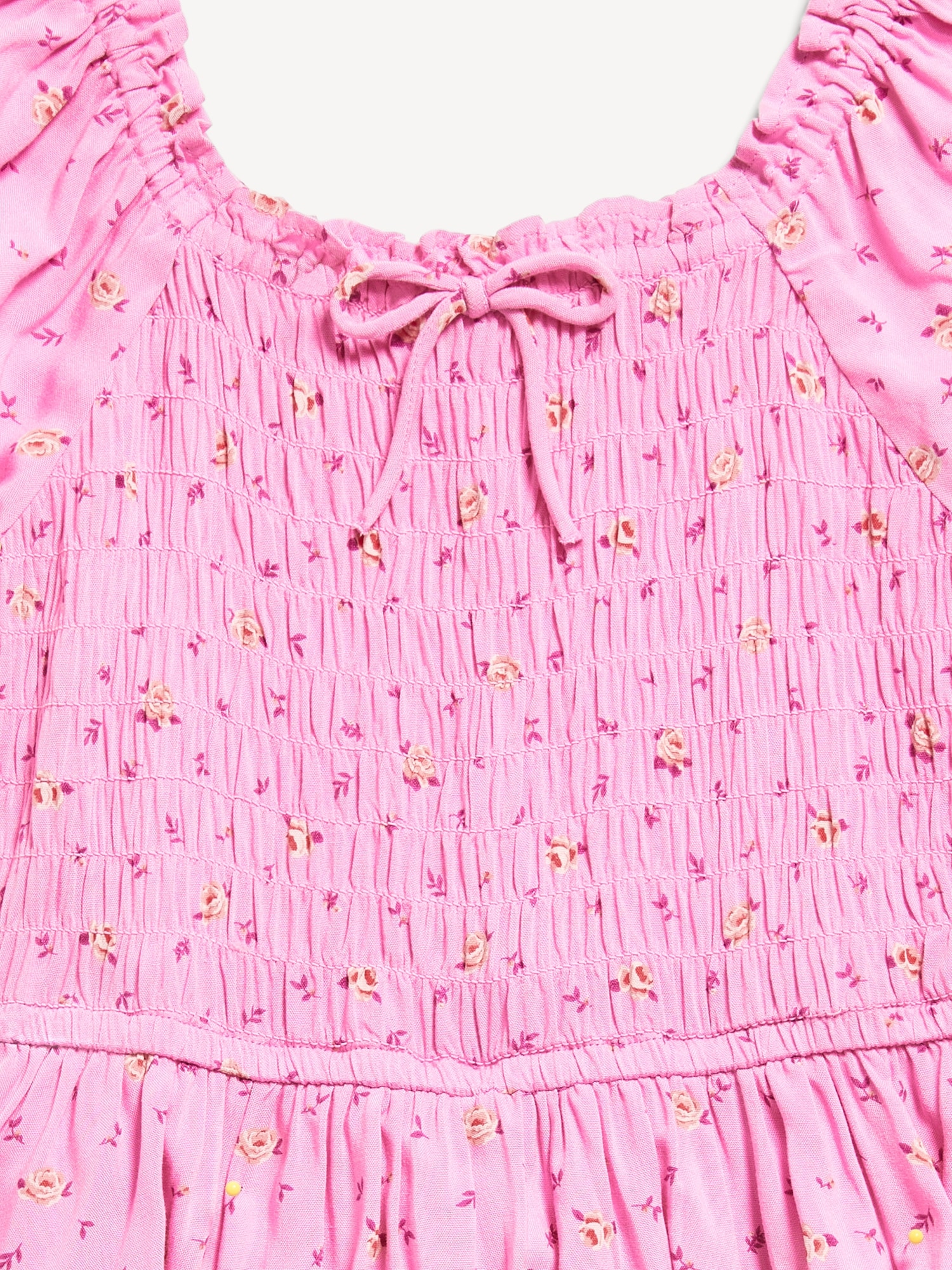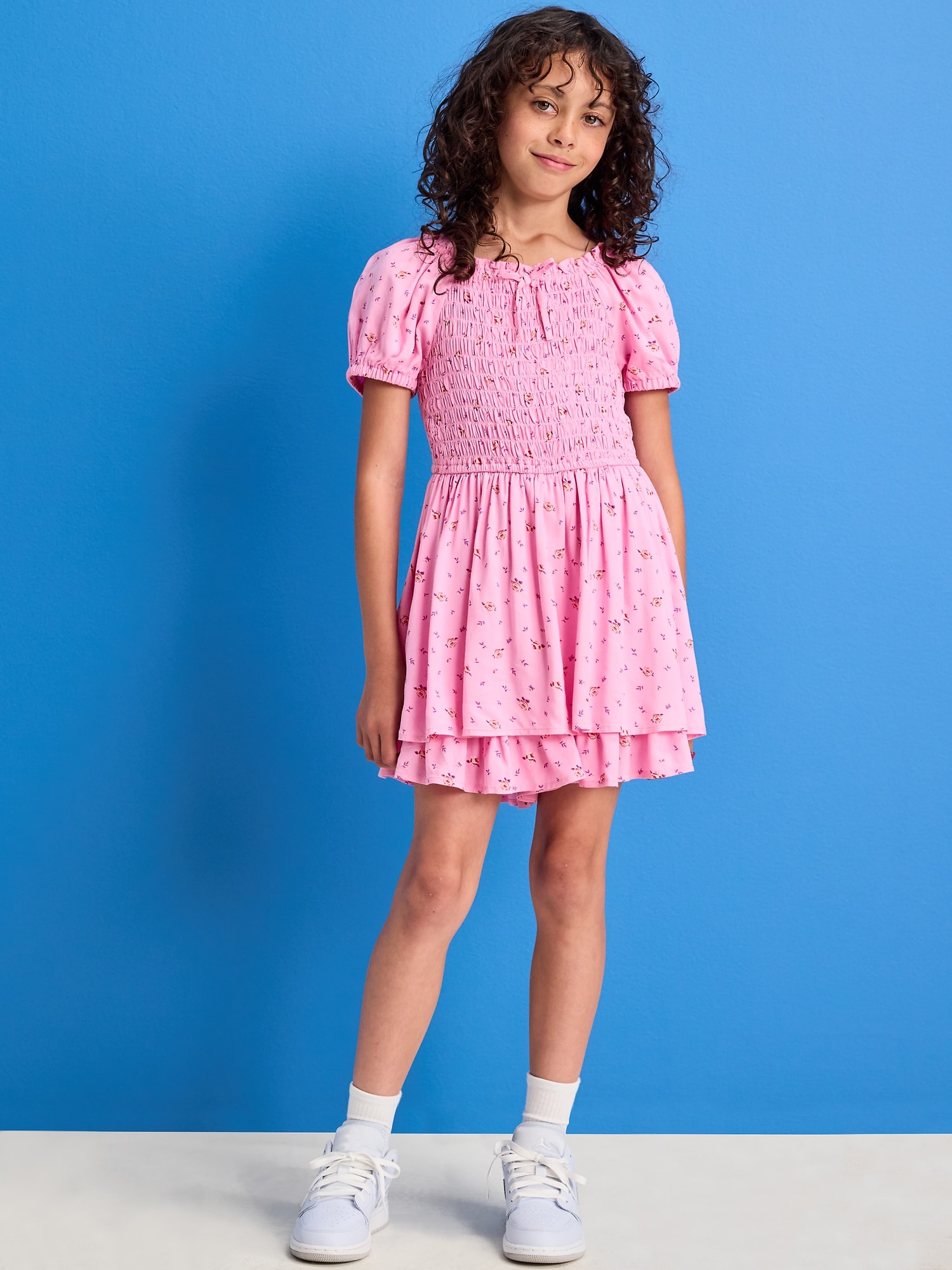 Printed Puff-Sleeve Smocked Dress for Girls: ruffled square neckline, short puff sleeves, smocked back, seamed waist, flowy skirt, built-in shorts, layered look at bottom, all-over print, #766638