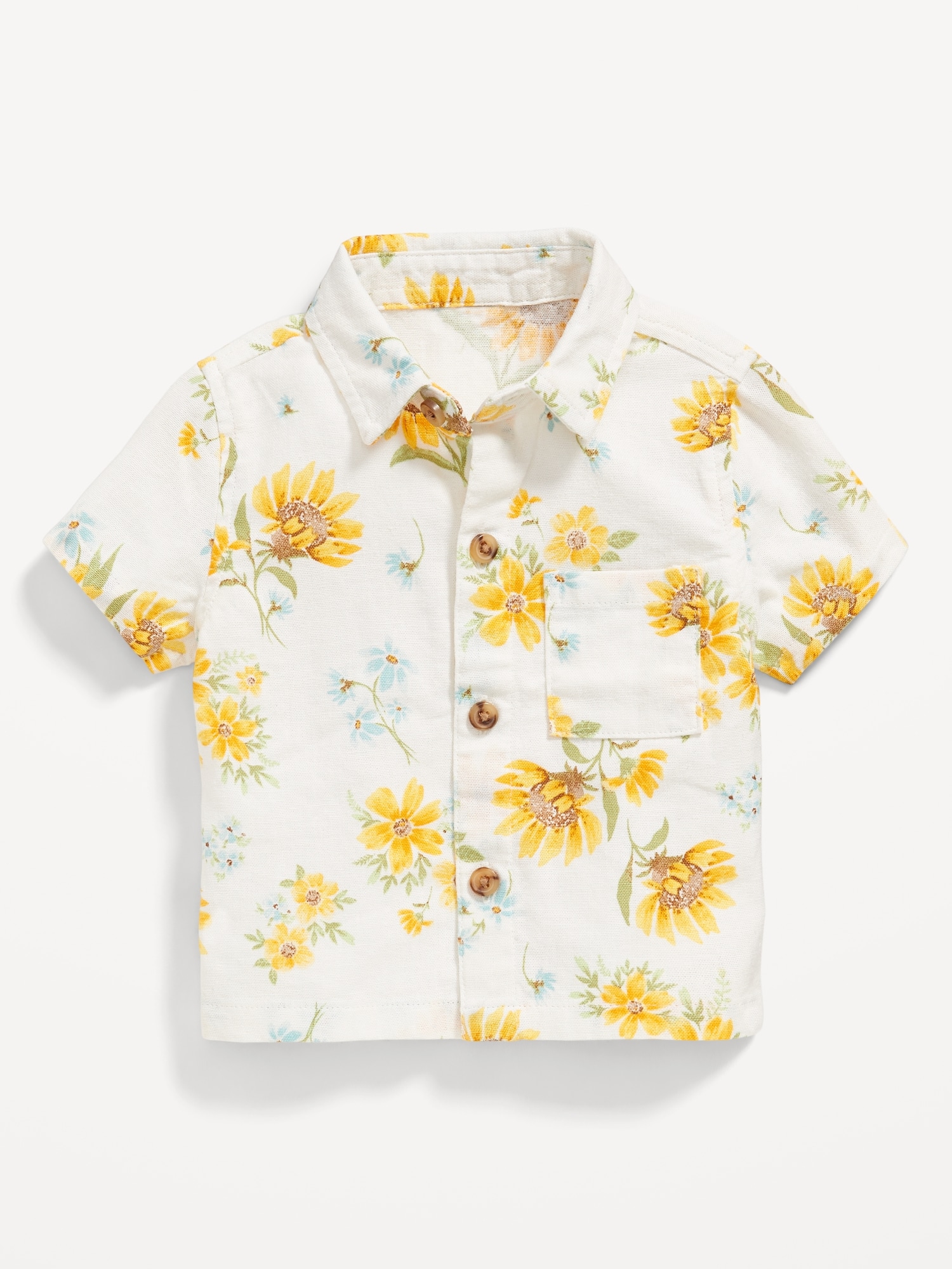 Printed Short-Sleeve Linen-Blend Shirt for Baby: spread collar, short sleeves, full length buttoned placket, side slits at hem, embroidered trim along collar and cuffs (select colors), #762248