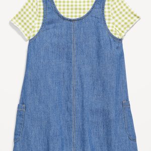 Printed Short-Sleeve T-Shirt and Jean Dress Set for Toddler Girls: crew neck, short sleeves, all-over print, coordinating dress, square neckline, scoop back, adjustable shoulder straps, side patch pockets, #766996