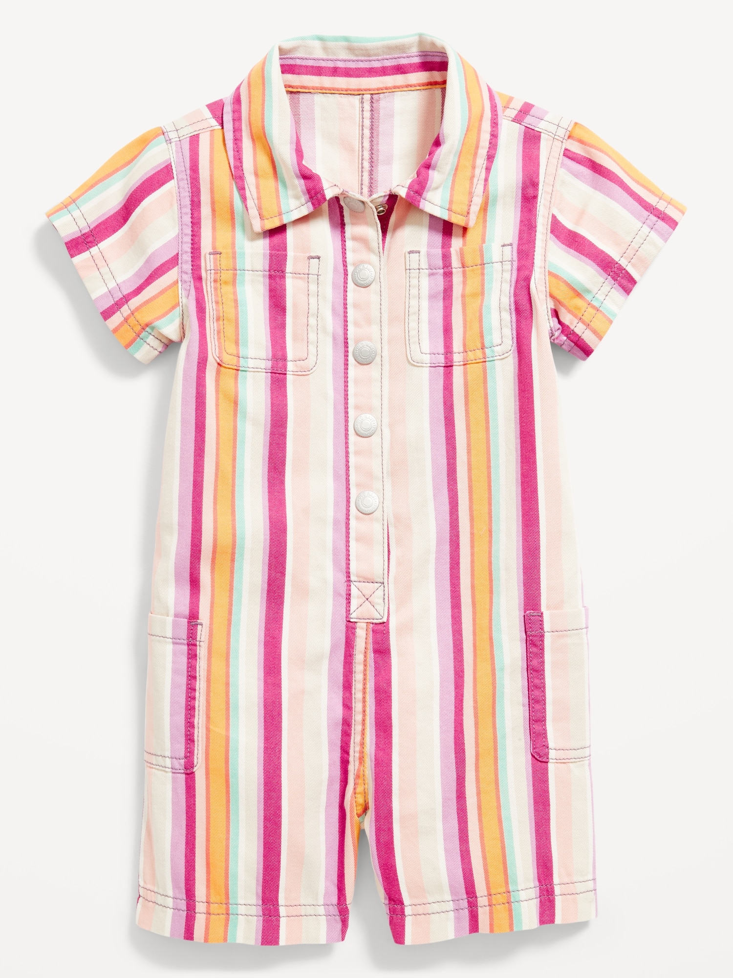 Printed Short-Sleeve Utility Twill Romper for Toddler Girls: spread collar, short sleeves, utility patch pockets at chest, full length buttoned placket, side utility patch pockets, cinched center back, hidden snaps along inseam, all-over print, #767016