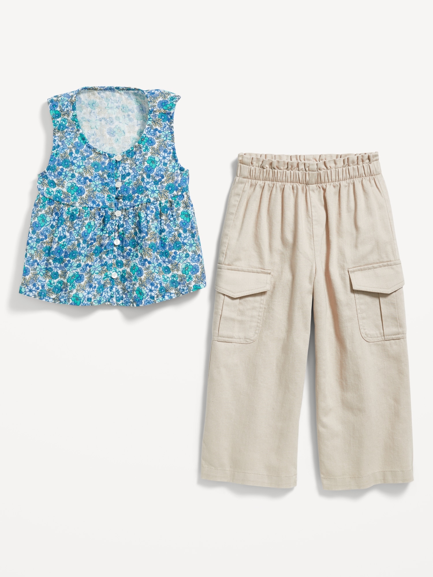 Printed Sleeveless Button-Front Top and Cargo Pants Set for Toddler Girls