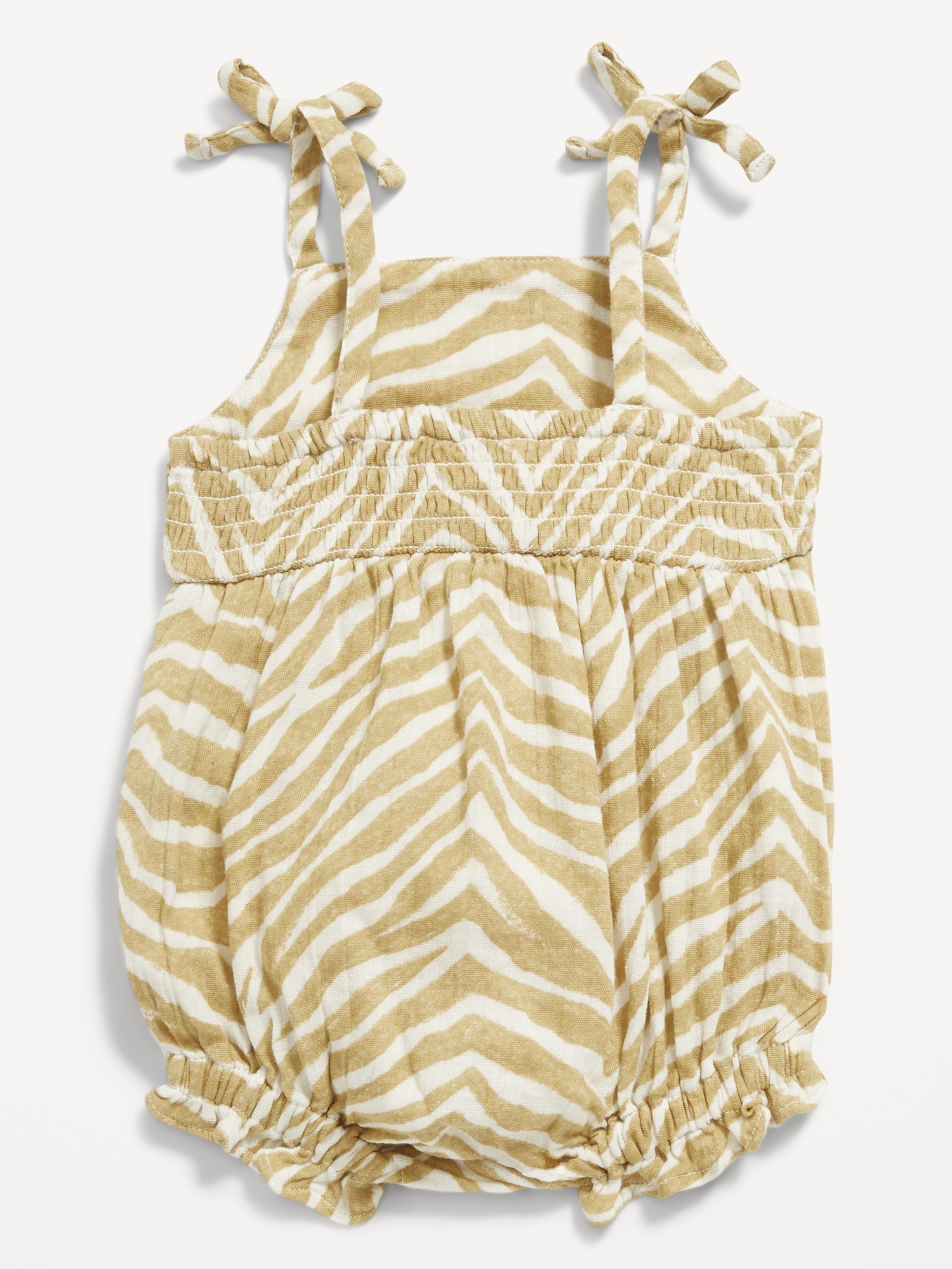 Printed Sleeveless Double-Weave One-Piece Romper for Baby: square neckline, thin shoulder straps, decorative ties at straps, seamed waist, smocked back, elasticized bubble leg cuffs, hidden snaps along inseam, all-over pattern, #761803