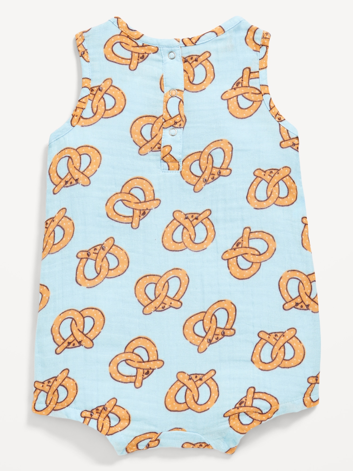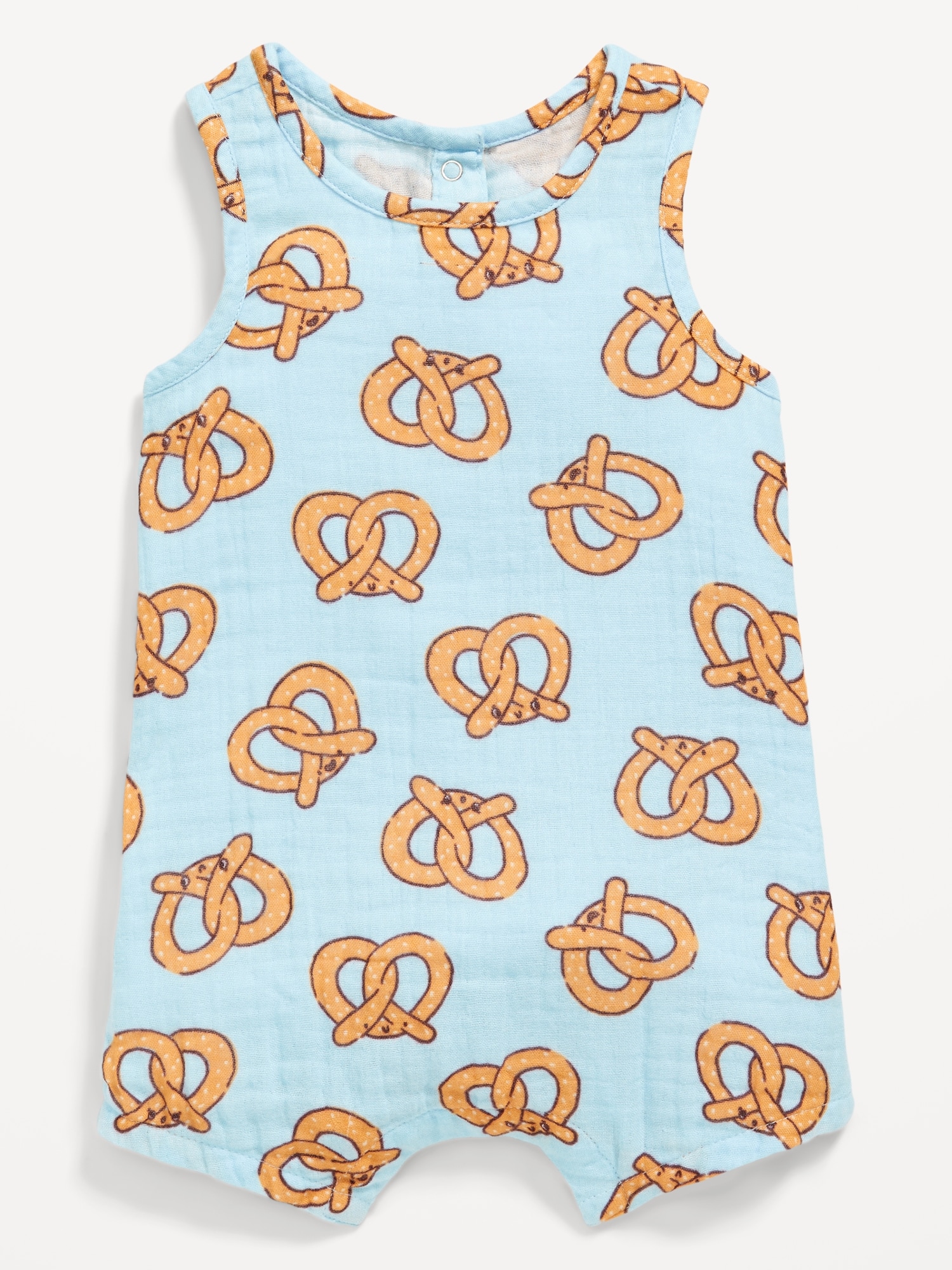 Printed Sleeveless Double-Weave One-Piece Romper for Baby: rounded neckline, sleeveless, snap-button placket at back, hidden snaps along inseam, all-over print, #761822