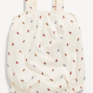 Printed Sleeveless One-Piece Romper for Baby: straight elasticized neckline, sleeveless, elasticized bubble leg cuffs, hidden snaps along inseam, all-over print, #689369