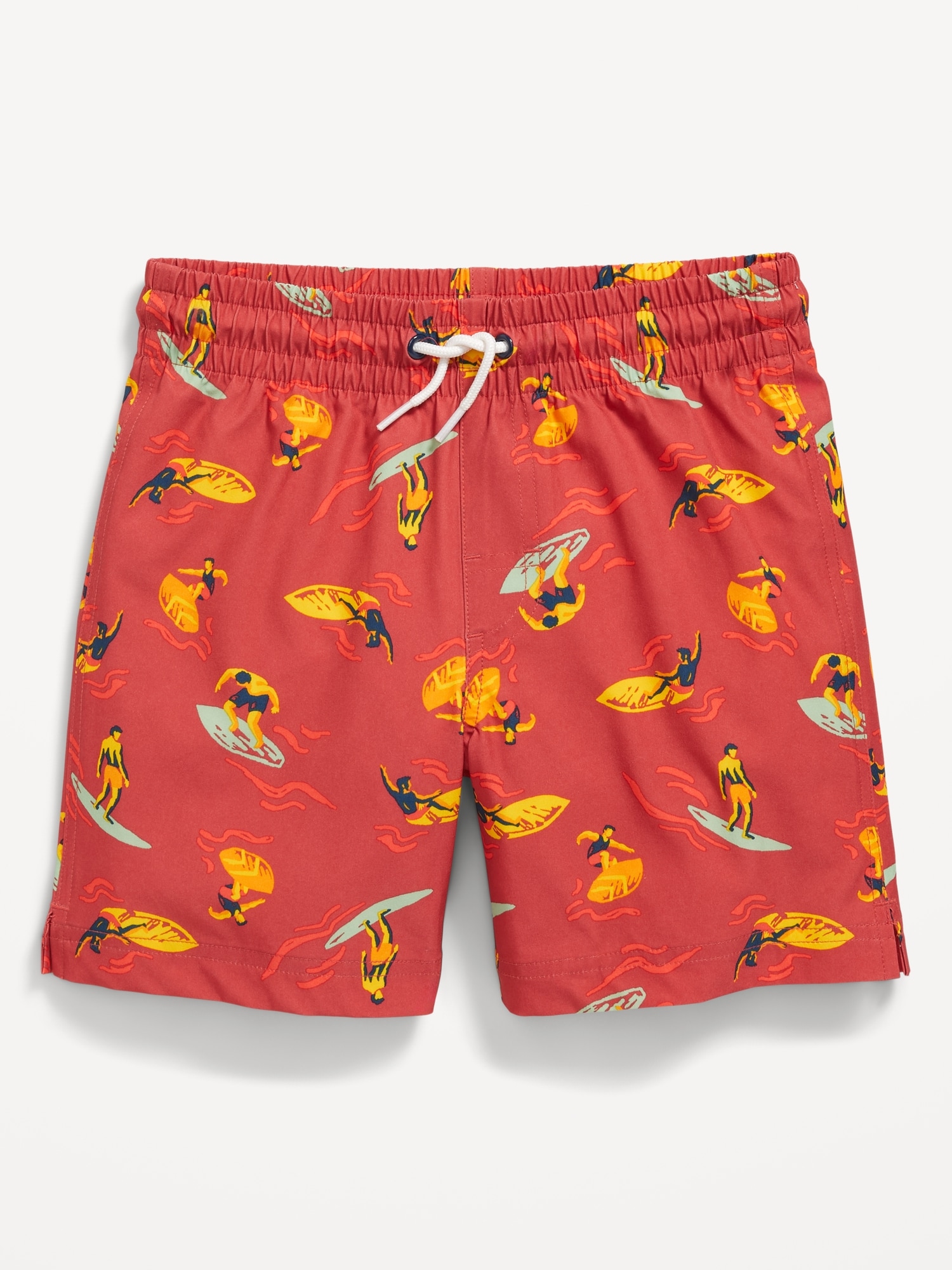Printed Swim Shorts for Boys: elasticized waistband, adjustable drawstring, faux fly, patch pocket at back right, built-in mesh briefs, #861691