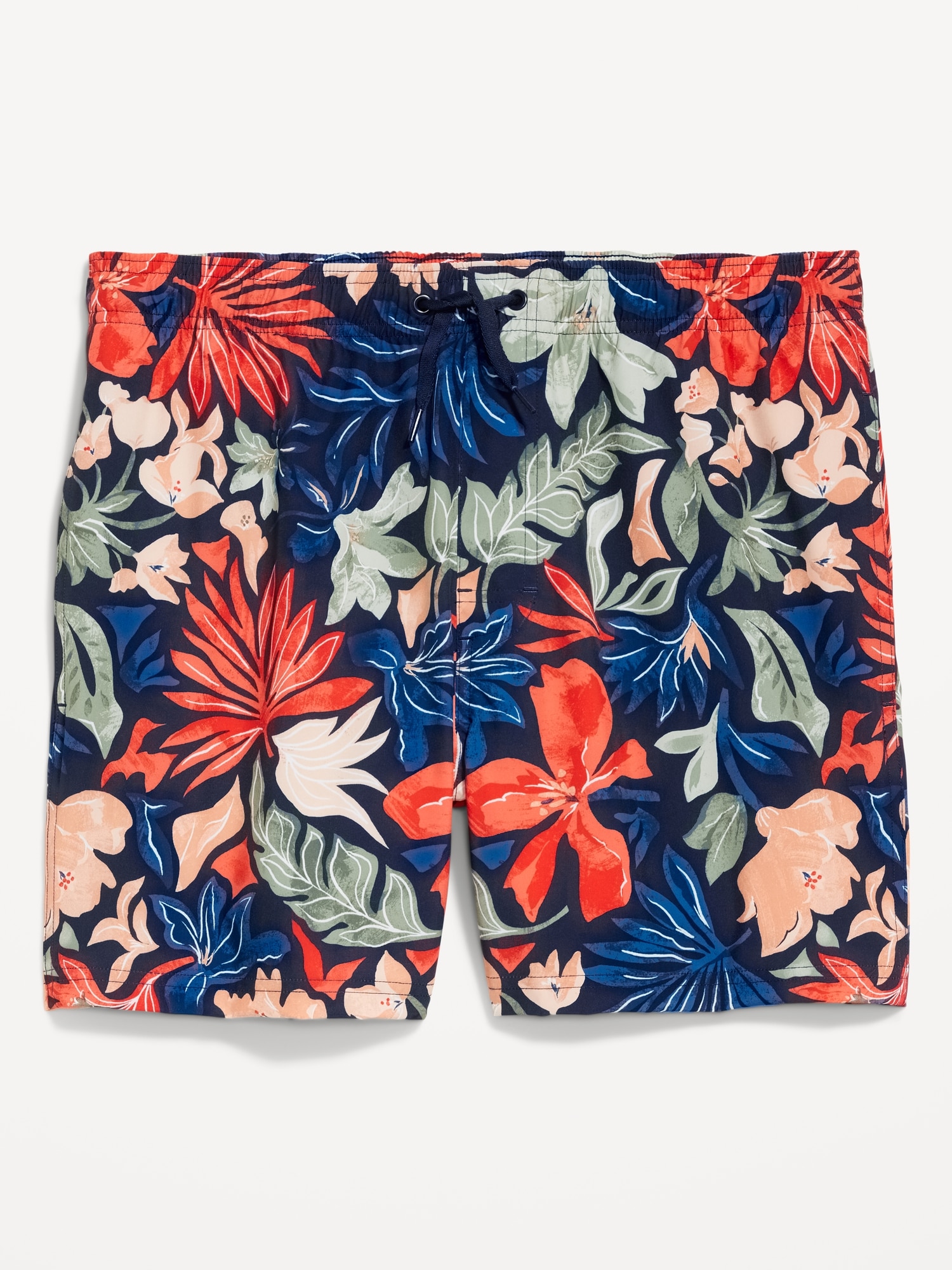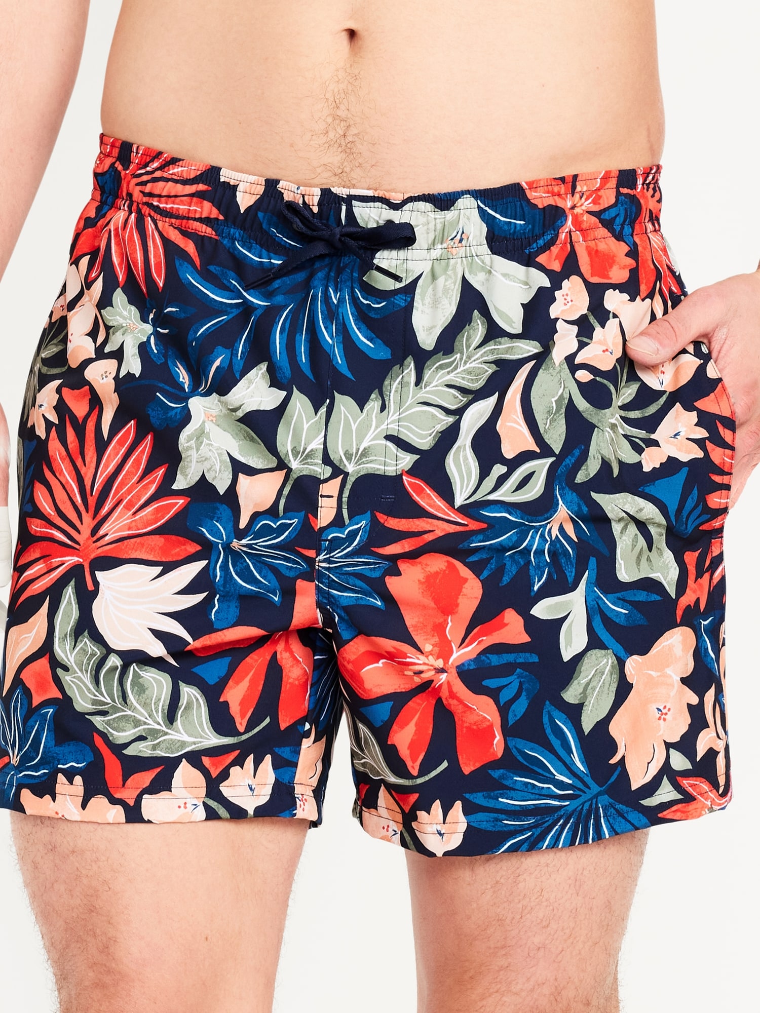 Printed Swim Trunks — 5-inch inseam: elastic-drawstring waistband, on-seam pockets, back pocket with grommet drain, built-in mesh briefs, pull-on style, all-over cocktail print, #766289