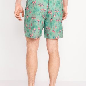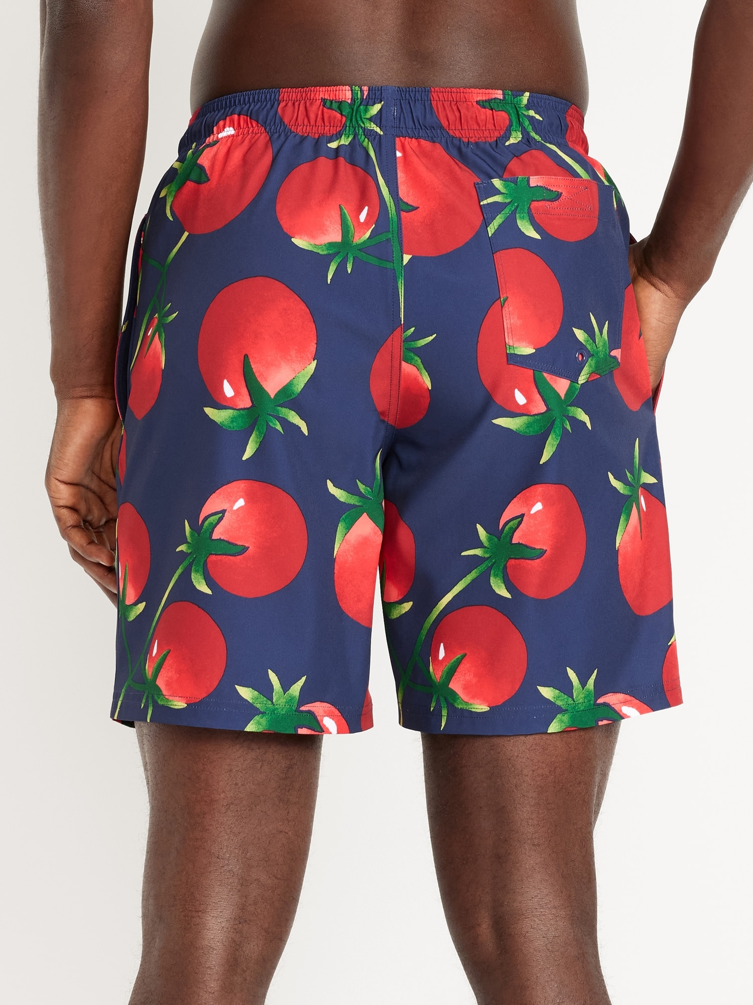 Printed Swim Trunks — 7-inch inseam: elastic-drawstring waistband, on-seam pockets, back patch pocket with grommet drain, built-in mesh briefs, pull-on style, #766290