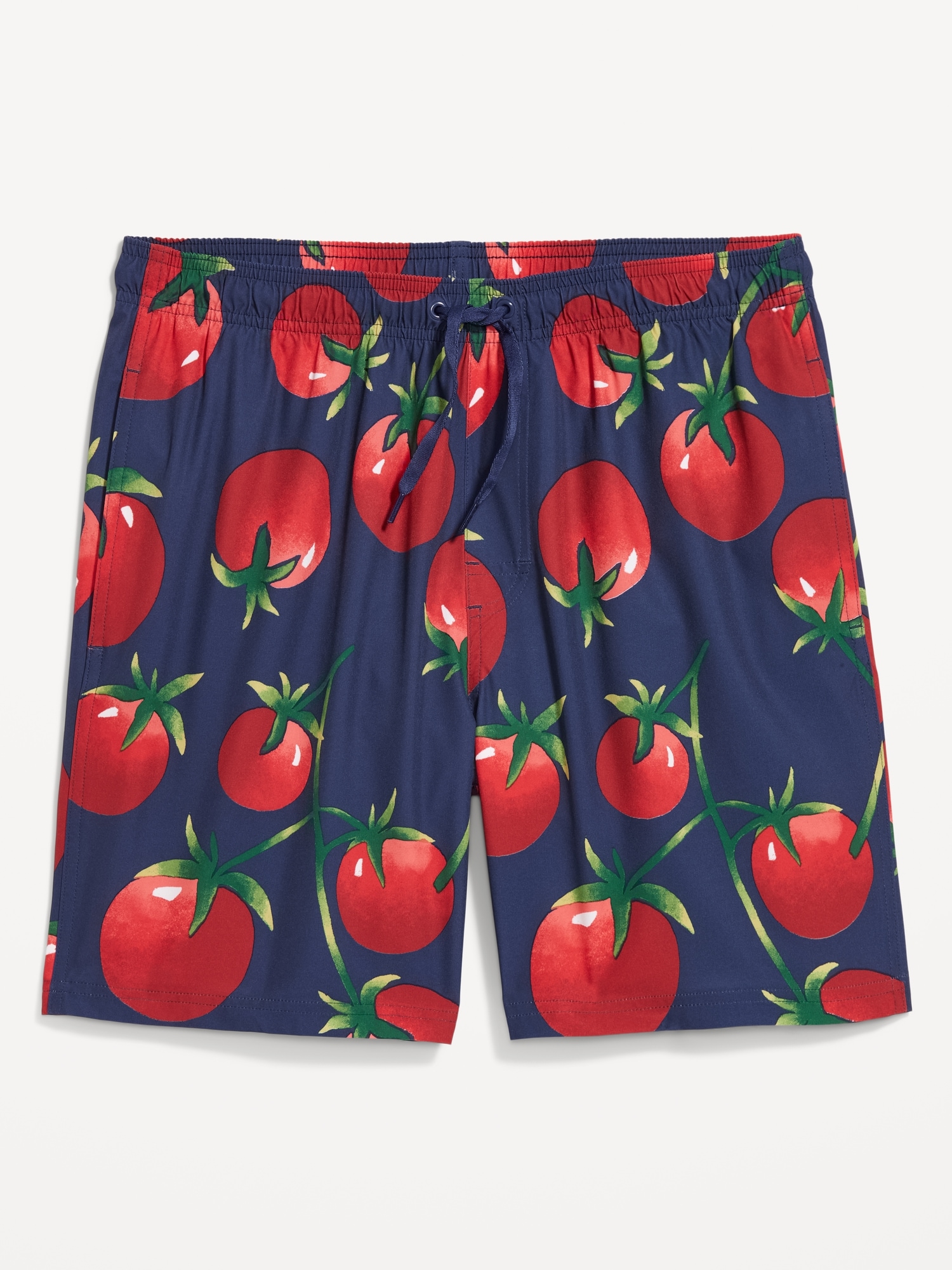 Printed Swim Trunks — 7-inch inseam: elastic-drawstring waistband, on-seam pockets, back patch pocket with grommet drain, built-in mesh briefs, pull-on style, #766290