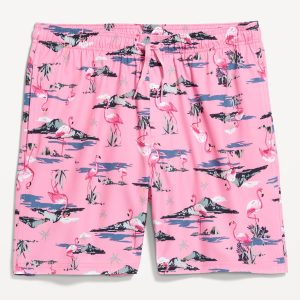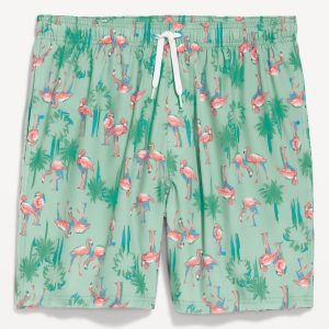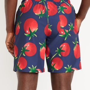 Printed Swim Trunks — 7-inch inseam: elastic-drawstring waistband, on-seam pockets, back patch pocket with grommet drain, built-in mesh briefs, pull-on style, #766290