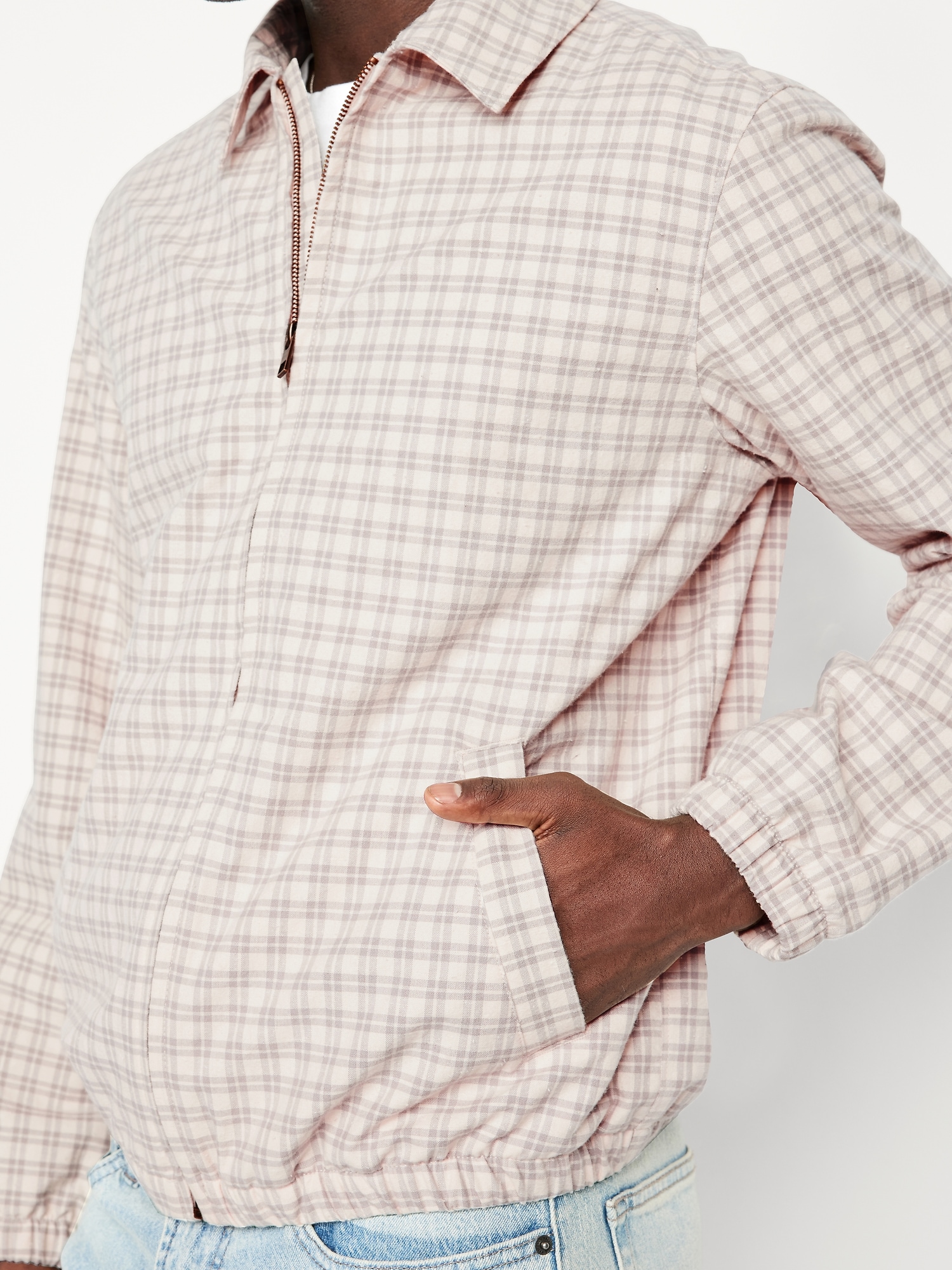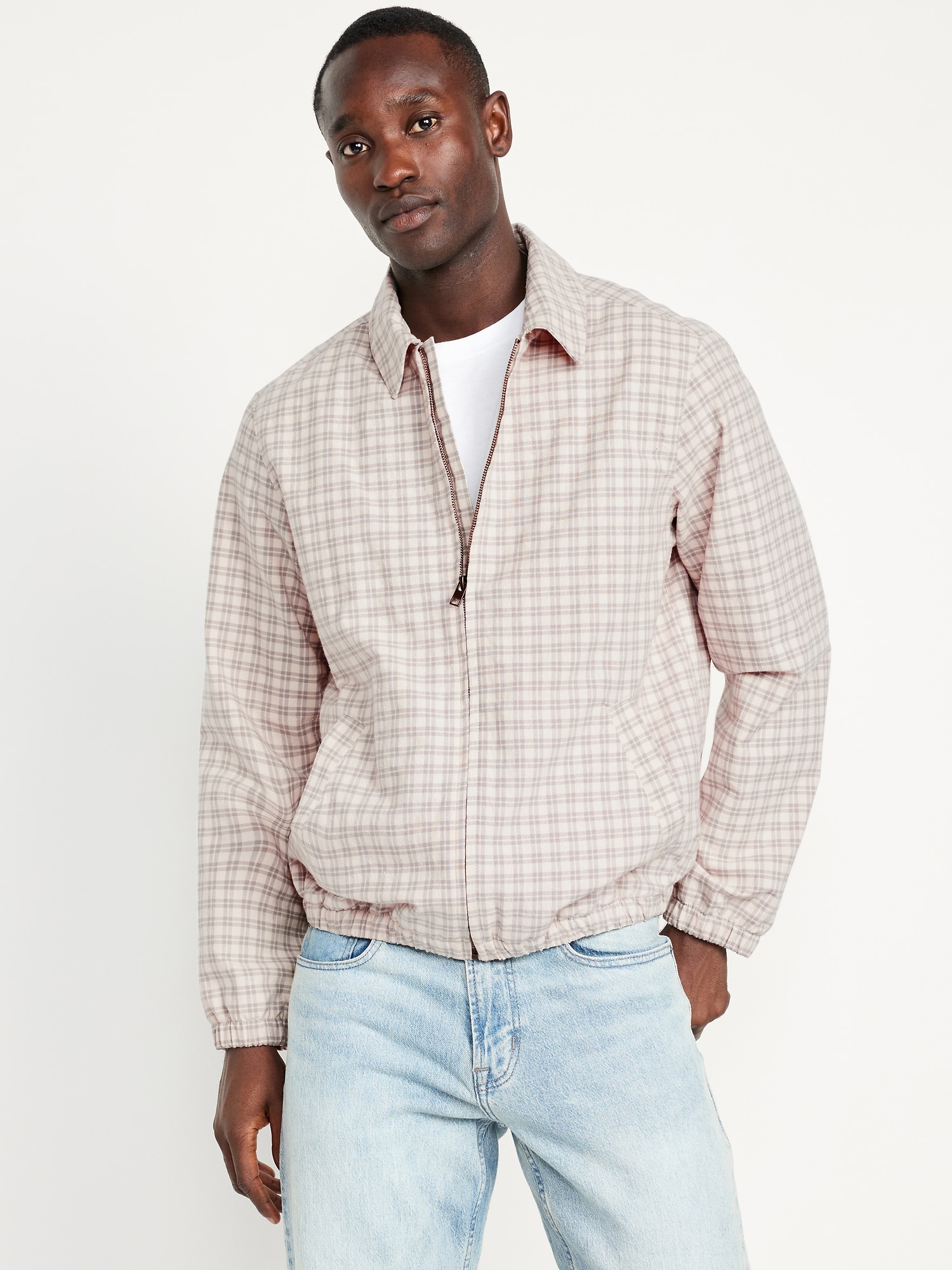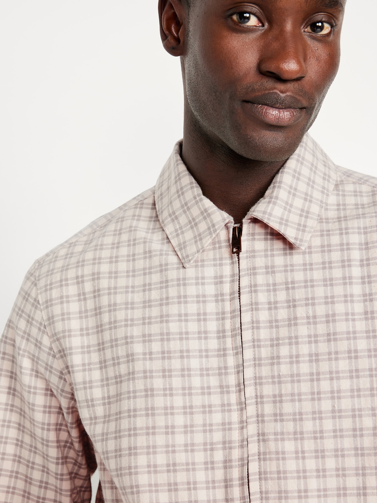Relaxed Zip Jacket: spread collar, long sleeves, full-zip front, welt pockets, gingham print, elastic cuffs and hem, #686458