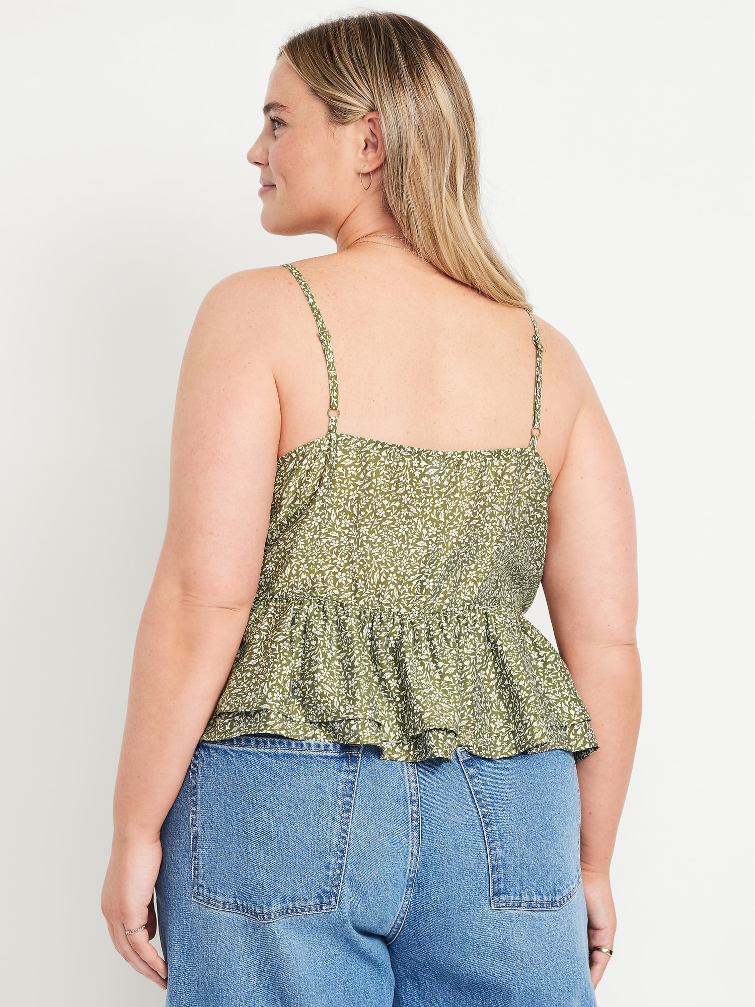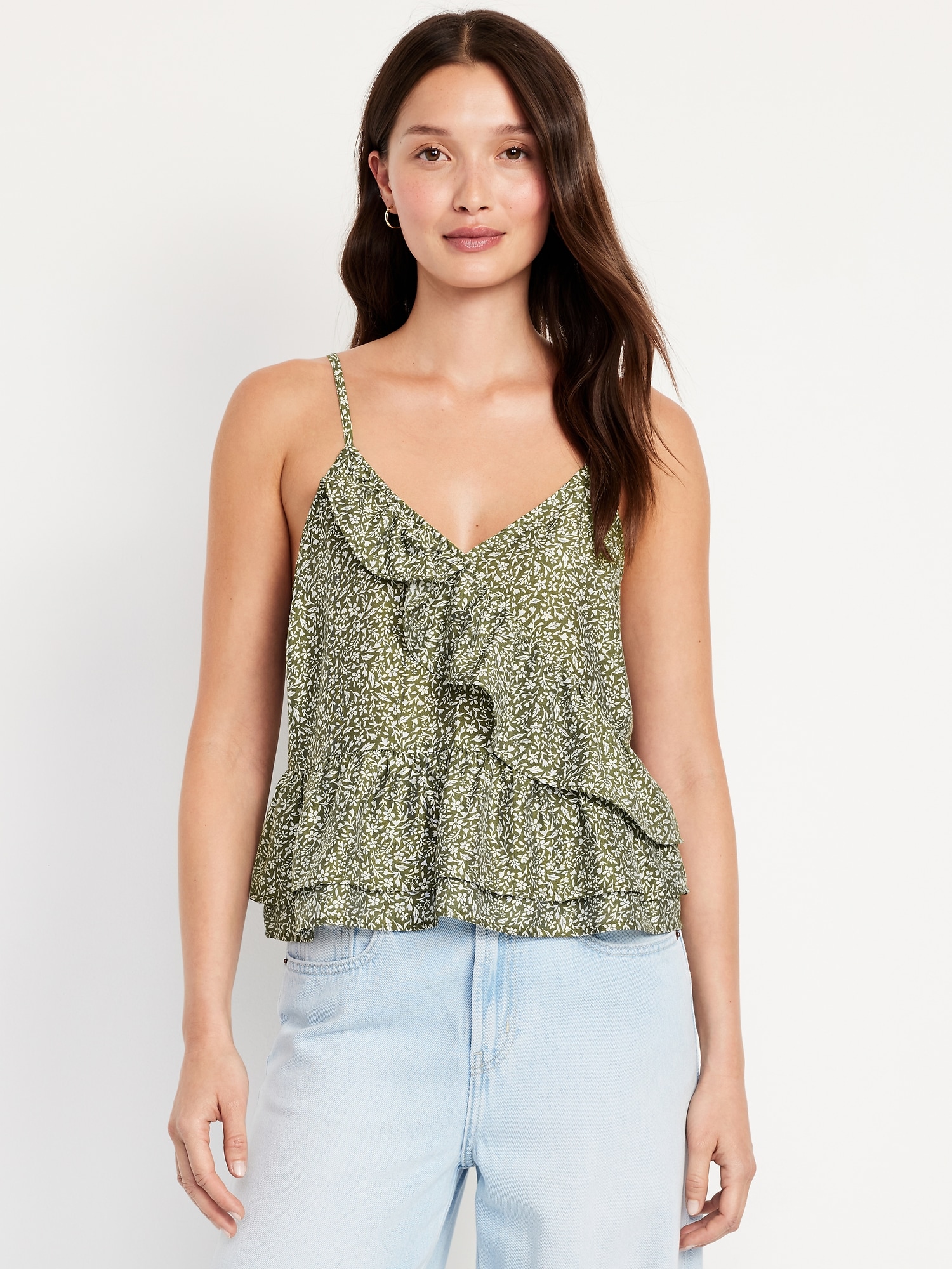 Ruffle Cami Top: v-neck, adjustable spaghetti straps, front ruffle trim, shirred peplum hem, #805745