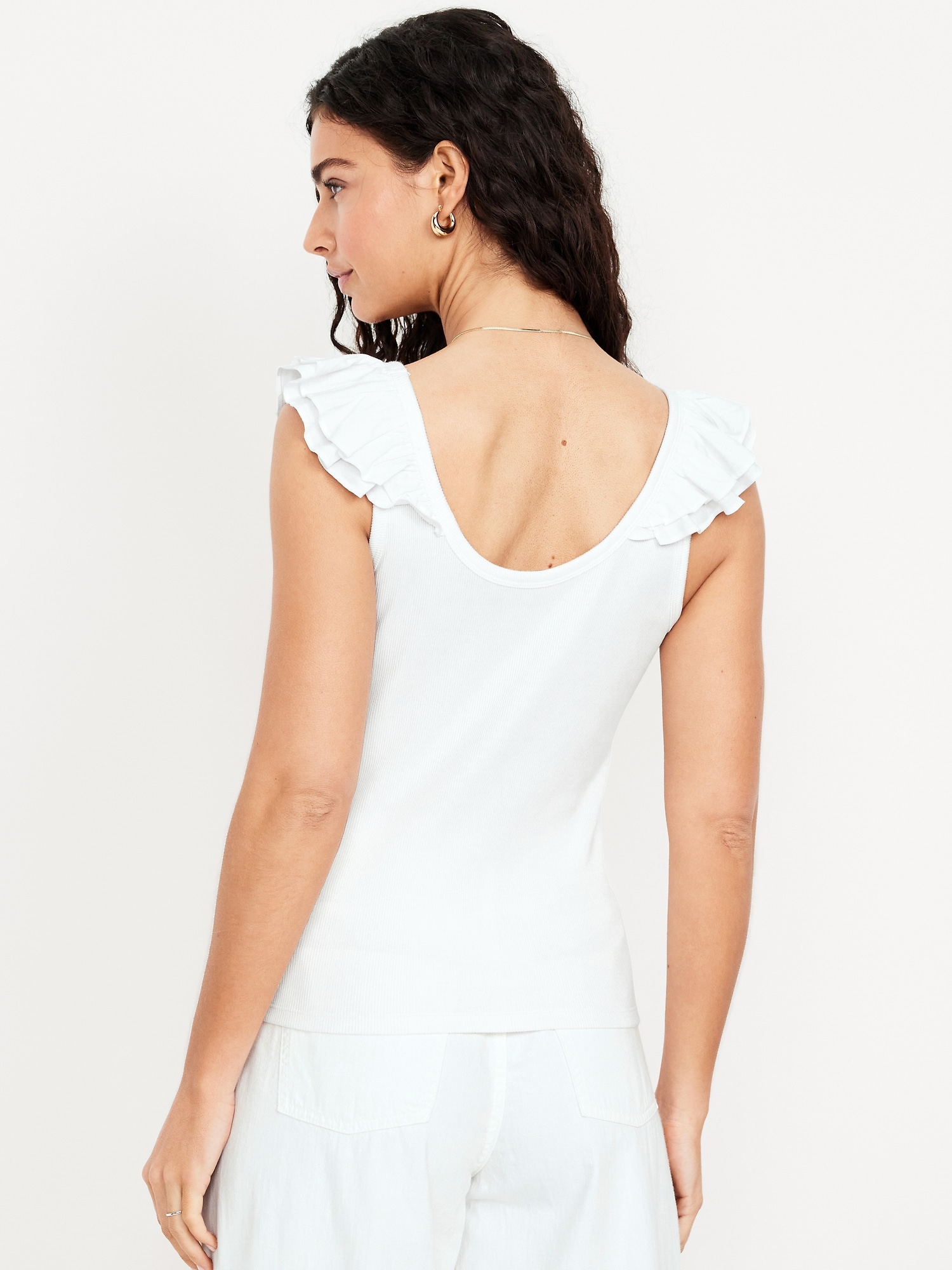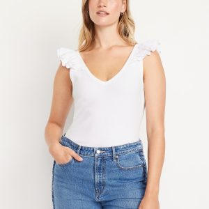 Ruffle-Trim Mixed Material Top: v-neck, ruffled sleeve openings, #686637