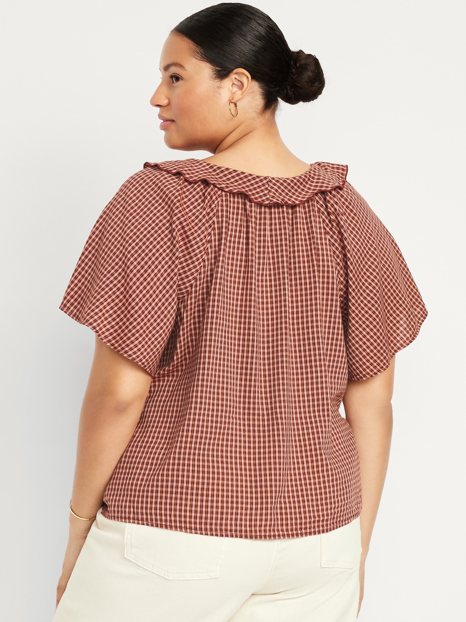 Ruffle V-Neck Top: tie-front v-neck, ruffle overlay at front, short flutter sleeves, #805737