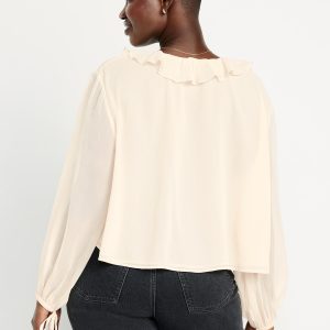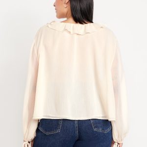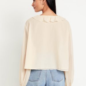 Ruffled Chiffon Cropped Blouse: ruffled v-neck, long drop-shoulder sleeves, elastic tie cuffs, decorative tie front, #704110