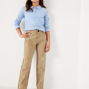 School Uniform Straight Leg Pants for Girls: interior adjustable waistband, sizes 5-8 snap-decorative button closure, sizes 10-20 regular button closure, zip fly, slant pockets in front, decorative welt pockets in back, #767121