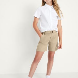 School Uniform Twill Bermuda Shorts for Girls: interior adjustable waistband, snap-button closure in sizes 5-8, regular button closure in sizes 10-20, zip fly, diagonal on-seam hip pockets, welt faux pockets at back, #767123