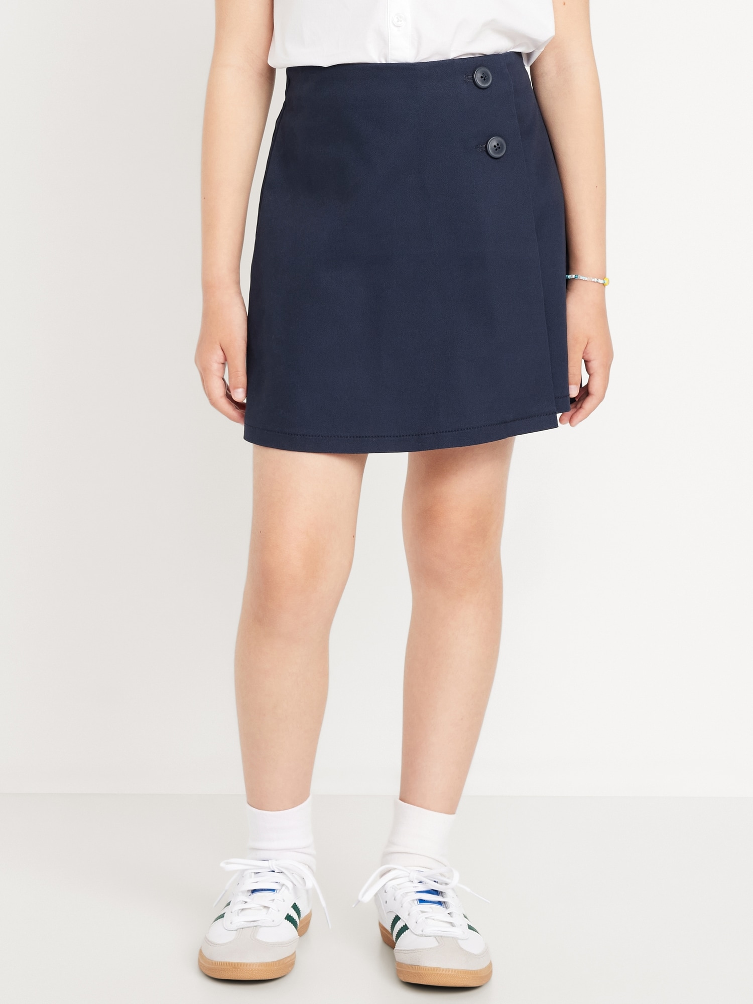 School Uniform Wrap-Front Skort for Girls: built-in shorts, elasticized back waist, decorative buttons, easy pull-on style, online exclusive, #766640