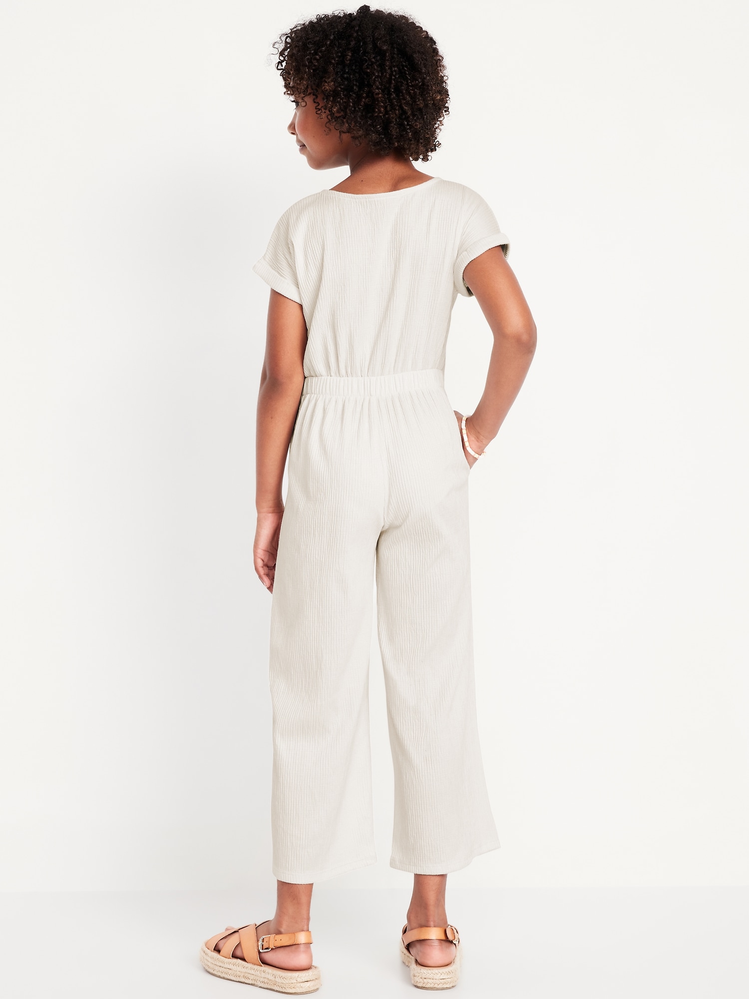 Short-Sleeve Button-Front Tie-Knot Jumpsuit for Girls: rounded neckline, short rolled sleeves, button-front, tie-knot, keyhole cutout at front, elasticized waistband, on-seam pockets, #690975