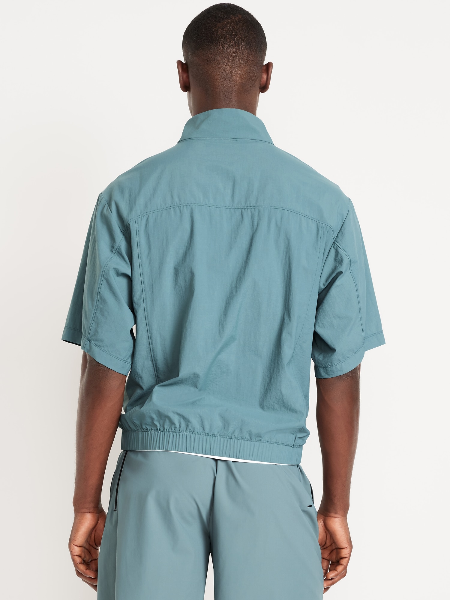 Short-Sleeve Nylon Half-Zip Top: mock neck, short sleeves, half-zip front, vertical zip pockets, cinched-elastic hem, contrasting piping at chest, sleeve and side panels, #749727