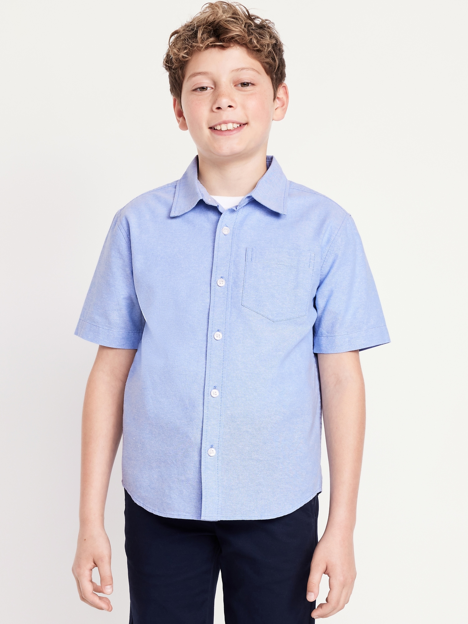 Short-Sleeve Oxford Shirt for Boys: spread collar, short sleeves, patch pocket at chest, full-length buttoned placket, all-over print, #865930
