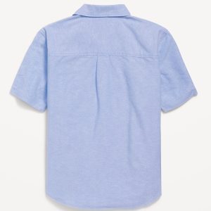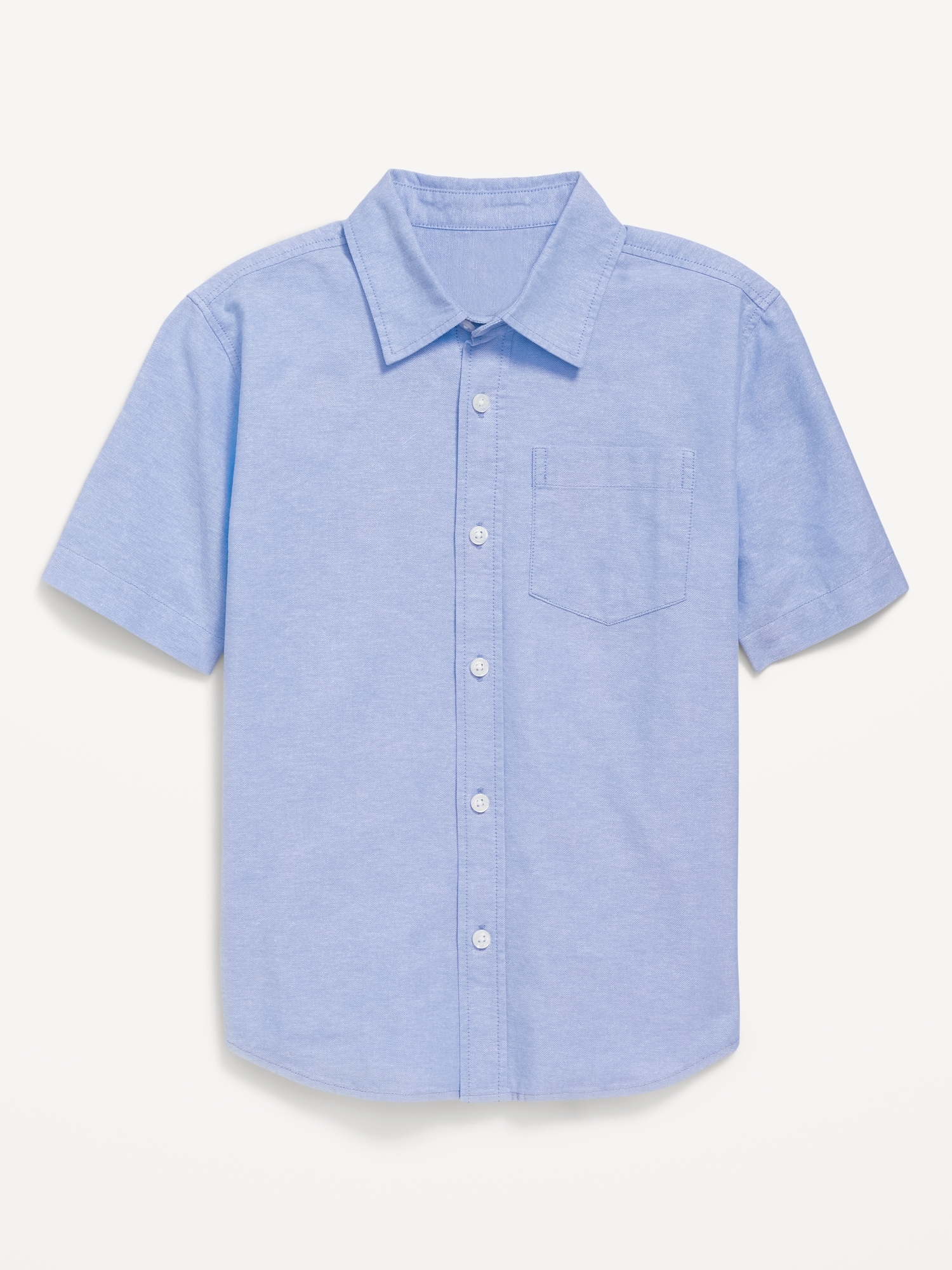 Short-Sleeve Oxford Shirt for Boys: spread collar, short sleeves, patch pocket at chest, full-length buttoned placket, all-over print, #865930