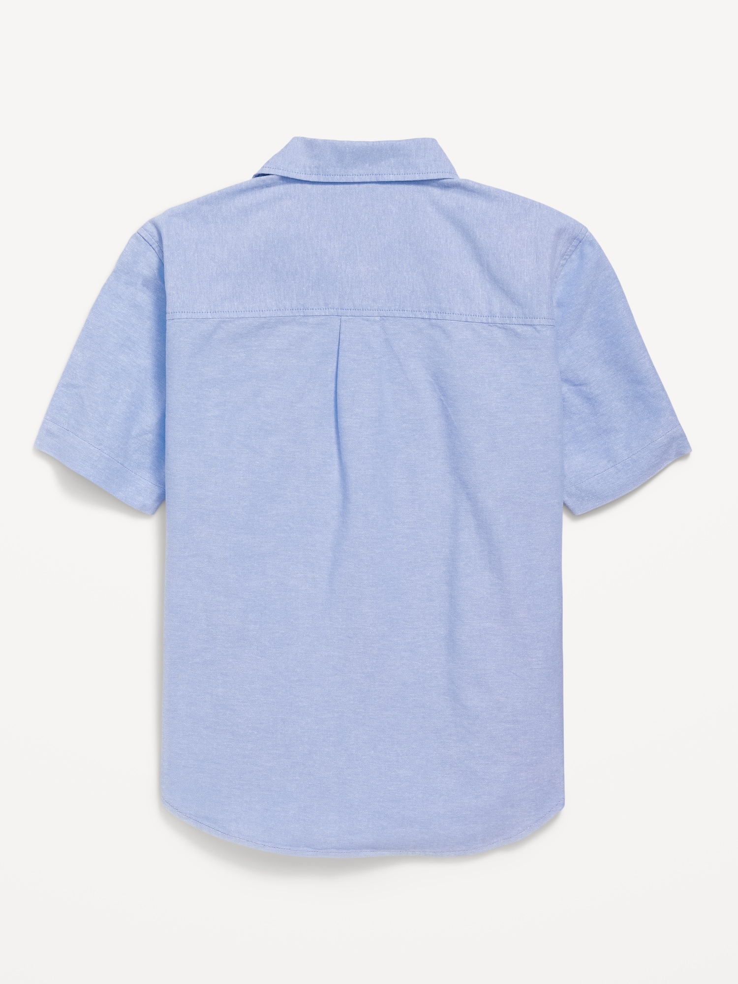 Short-Sleeve Oxford Shirt for Boys: spread collar, short sleeves, patch pocket at chest, full-length buttoned placket, all-over print, #865930