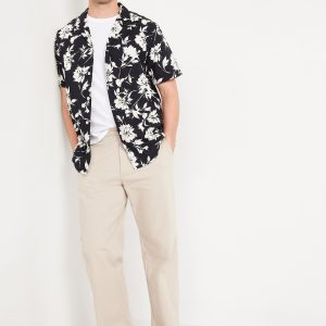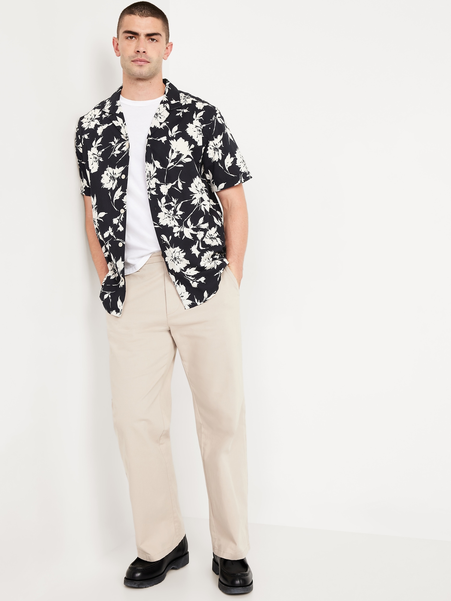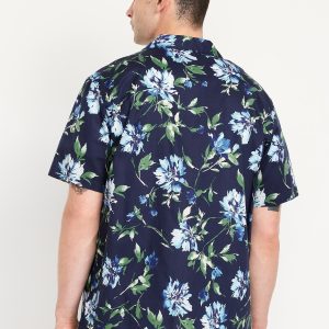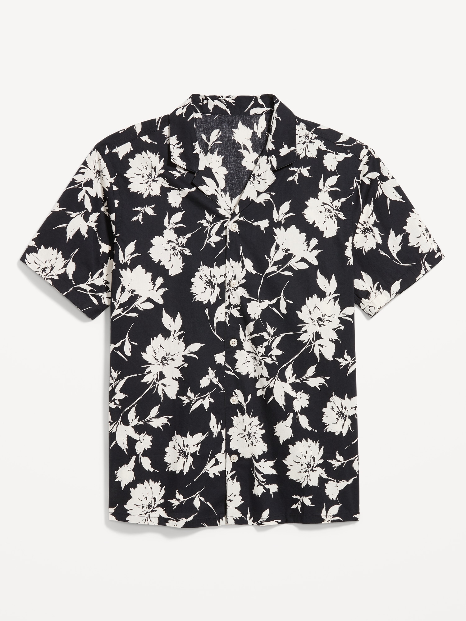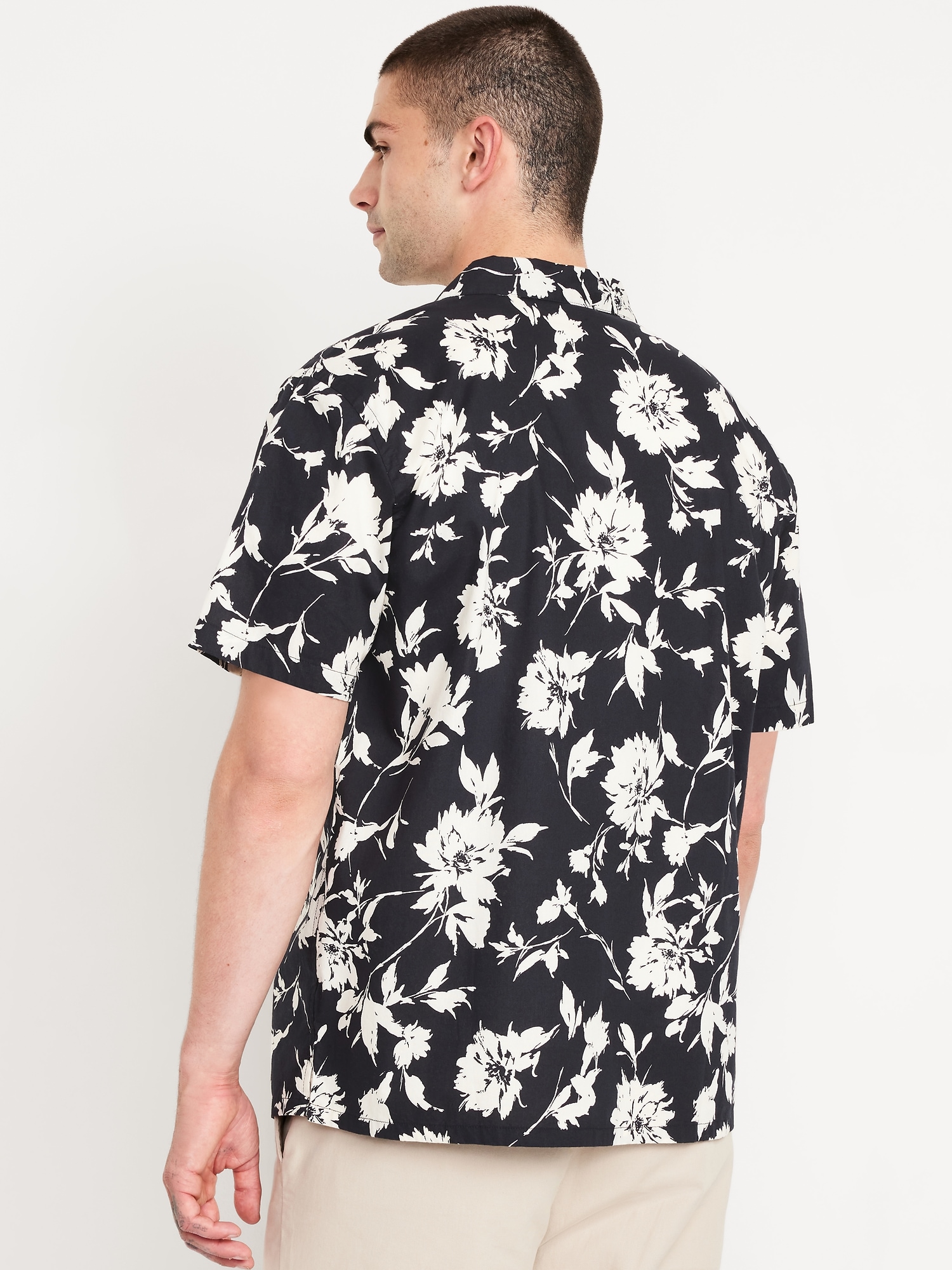 Short-Sleeve Printed Camp Shirt: notched collar, short sleeves, full-button front, vertical striped print, #762762
