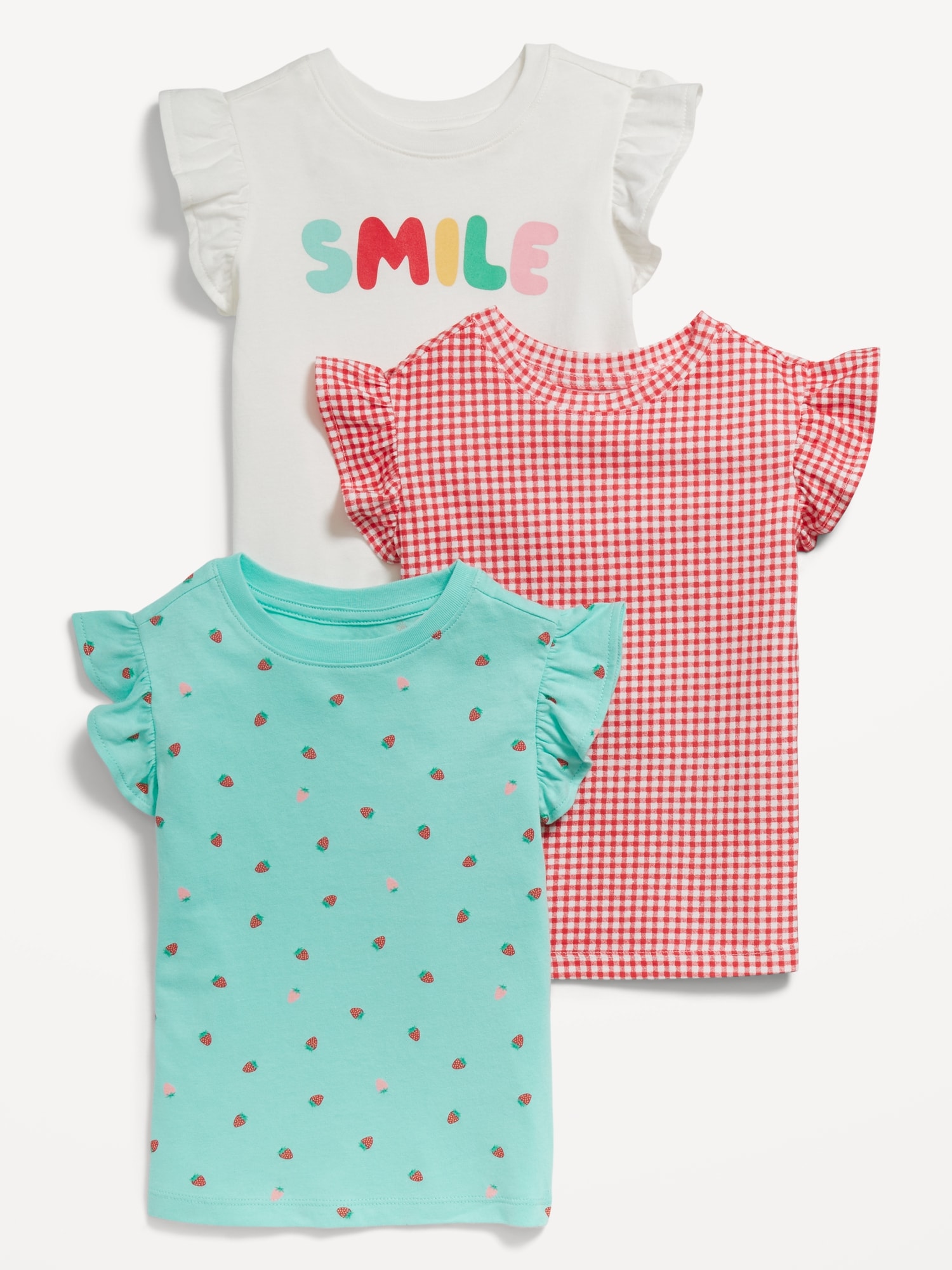 Short-Sleeve Ruffle-Trim T-Shirt 3-Pack for Toddler Girls: crew neck, short ruffled sleeves, all-over print or graphic, #689952