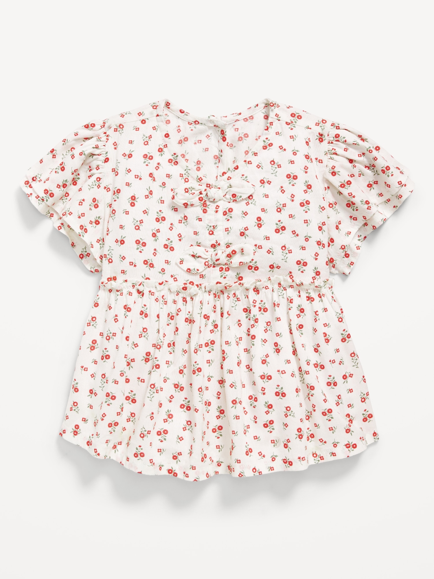 Short-Sleeve Ruffled Bow Top for Toddler Girls: v neck, short flutter sleeves, keyhole cutout at nape, seamed ruffled waist, decorative bows at front, flared hem, #804970