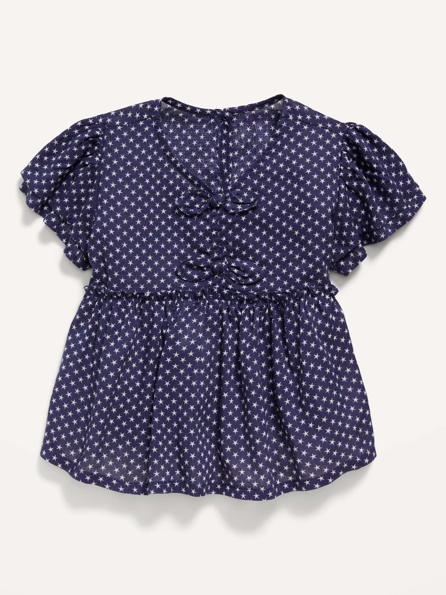 Short-Sleeve Ruffled Bow Top for Toddler Girls: v neck, short flutter sleeves, keyhole cutout at nape, seamed ruffled waist, decorative bows at front, flared hem, #804970