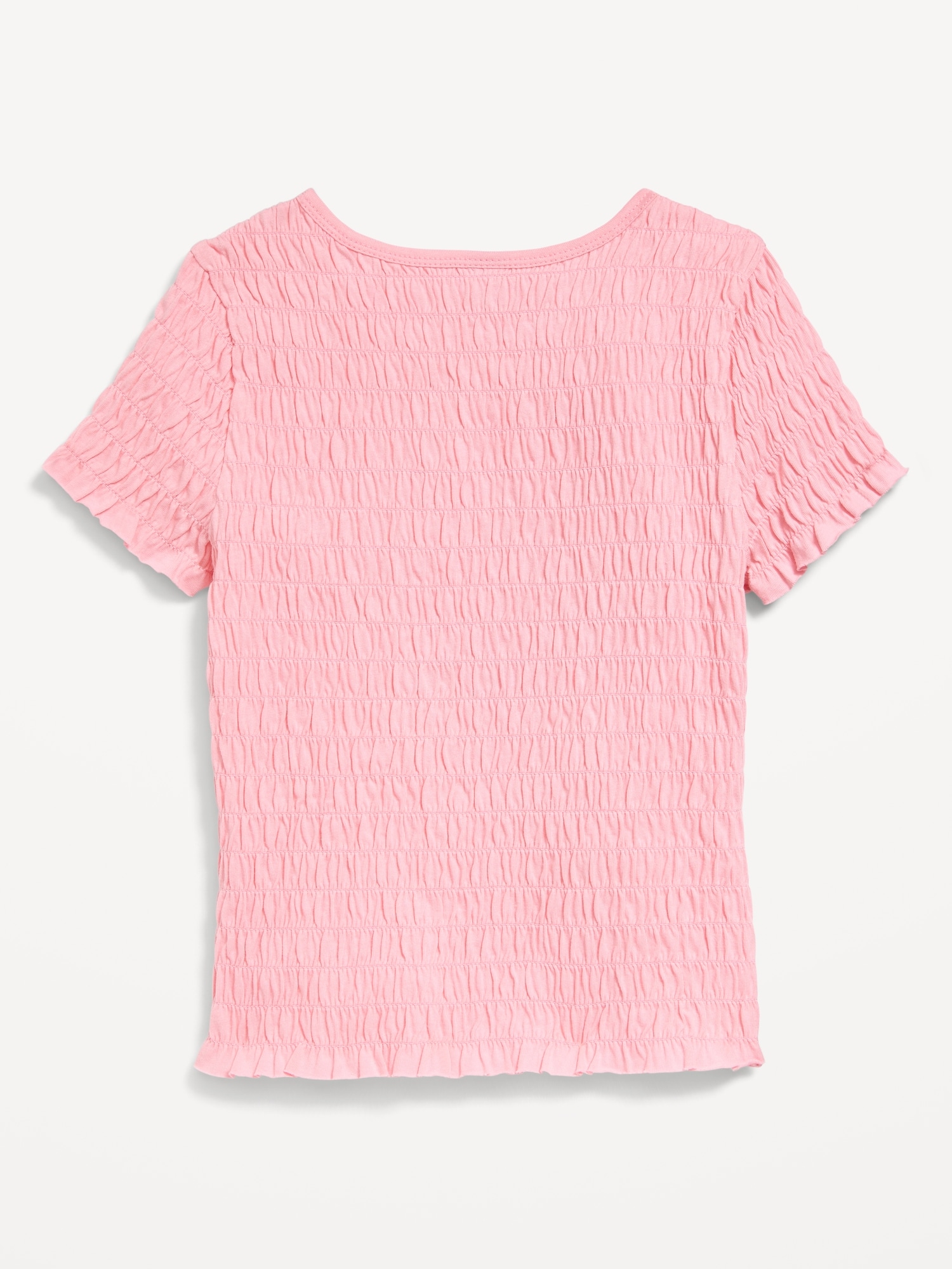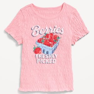 Short-Sleeve Smocked Graphic Top for Girls: scoop neck, short sleeves, graphic at front of, all-over textured smocking, #685279