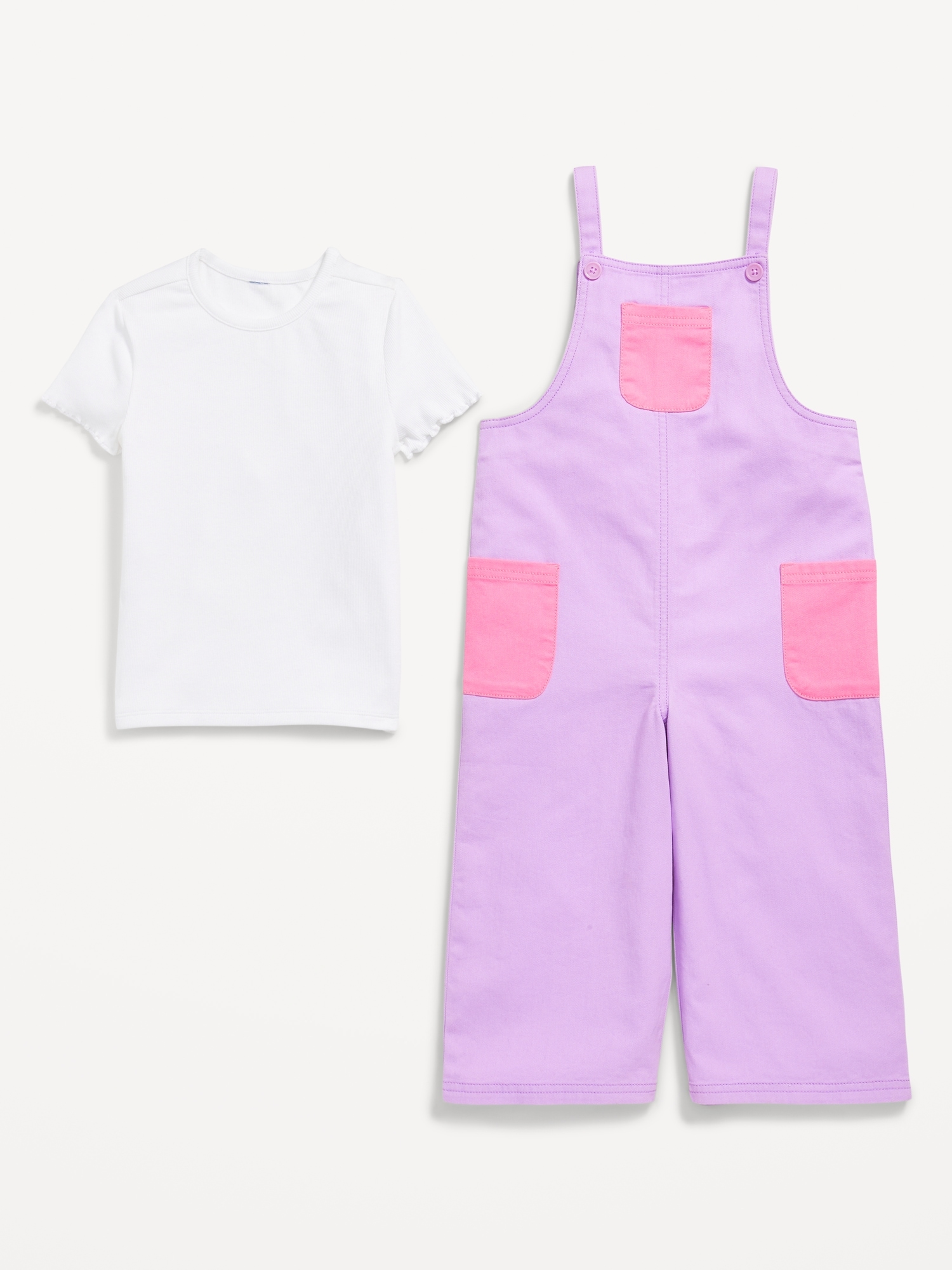 Short-Sleeve T-Shirt and Pocket Jumpsuit Set for Toddler Girls: crew neck, short sleeves, coordinating jumpsuit, square neckline, adjustable shoulder straps, patch pocket at front, patch pockets at hips, color block, #767011