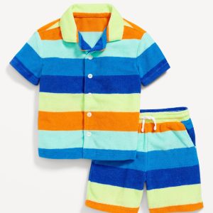 Short-Sleeve Terry Shirt and Shorts Set for Toddler Boys: spread collar, short sleeves, full length button placket, matching shorts, elasticized waistband, functional drawstring, diagonal on-seam pockets, single patch pocket at back, all-over stripes, #750655