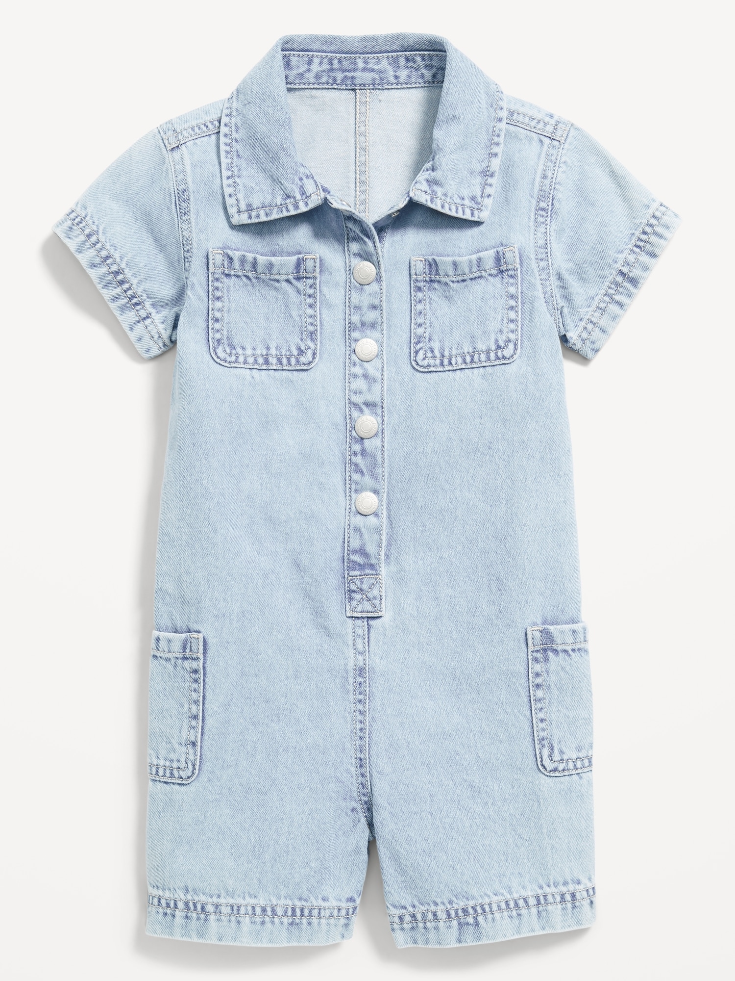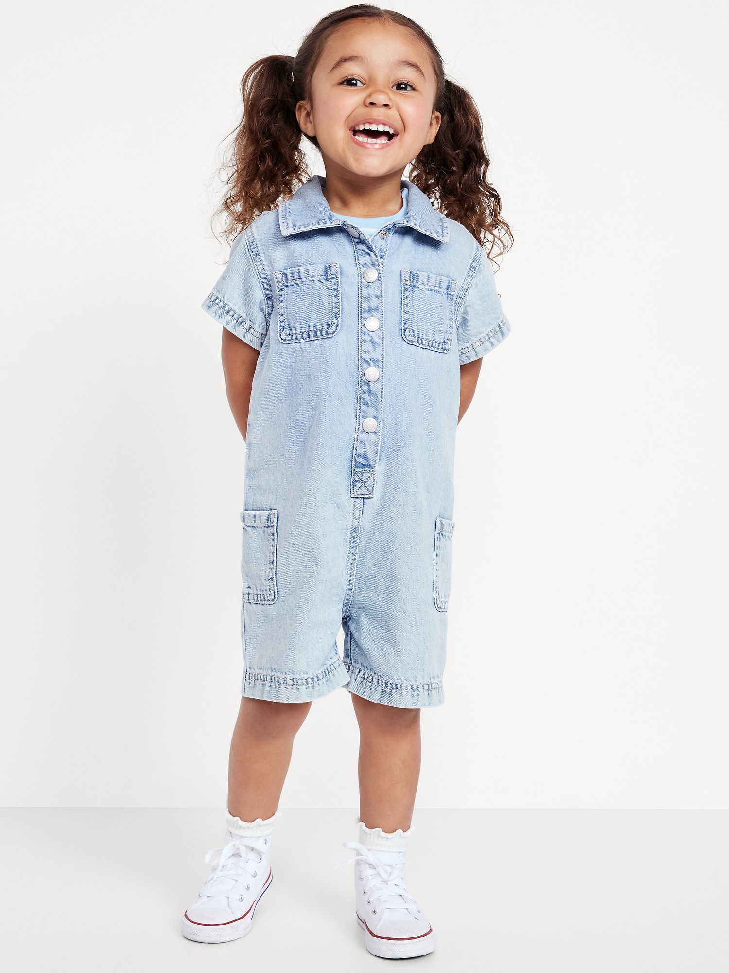 Short-Sleeve Utility Jean Romper for Toddler Girls: spread collar, short sleeves, utility patch pockets at chest, full length buttoned placket, side utility patch pockets, cinched center back, hidden snaps along inseam, all-over print, #767016
