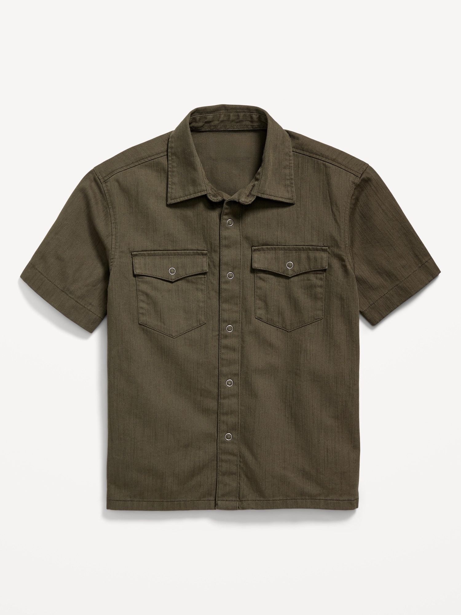 Short-Sleeve Western Pocket Shirt for Boys: pointed collar, short sleeves, snap-button flap pockets at chest, full length snap-button placket, #790172