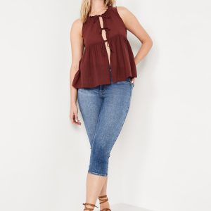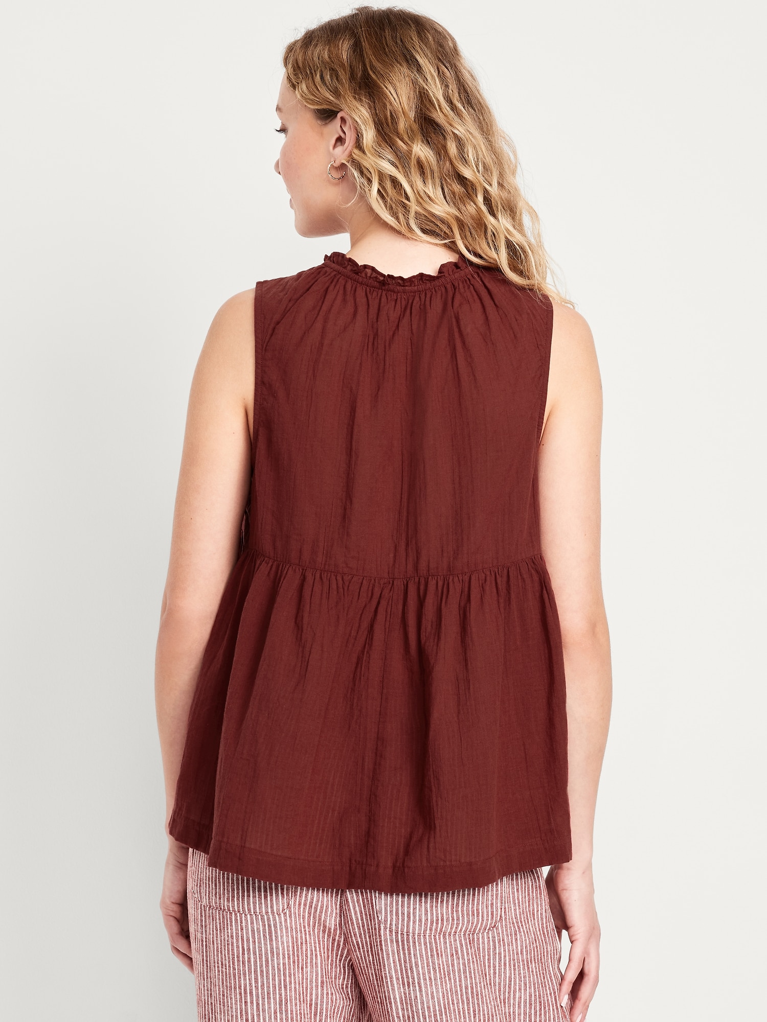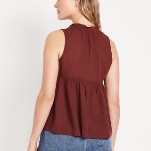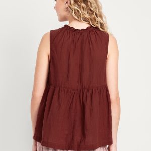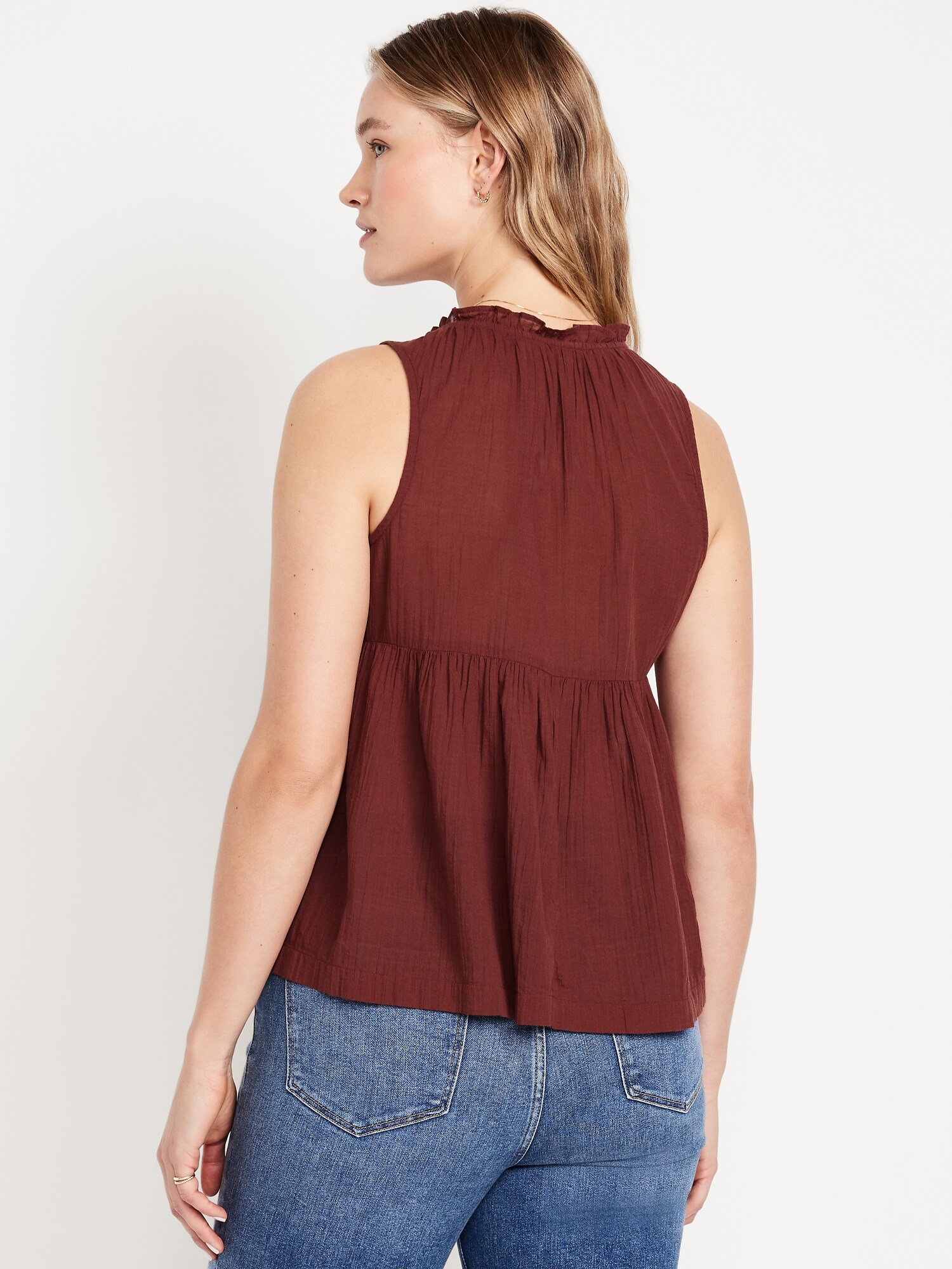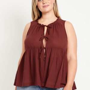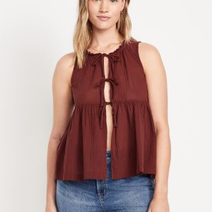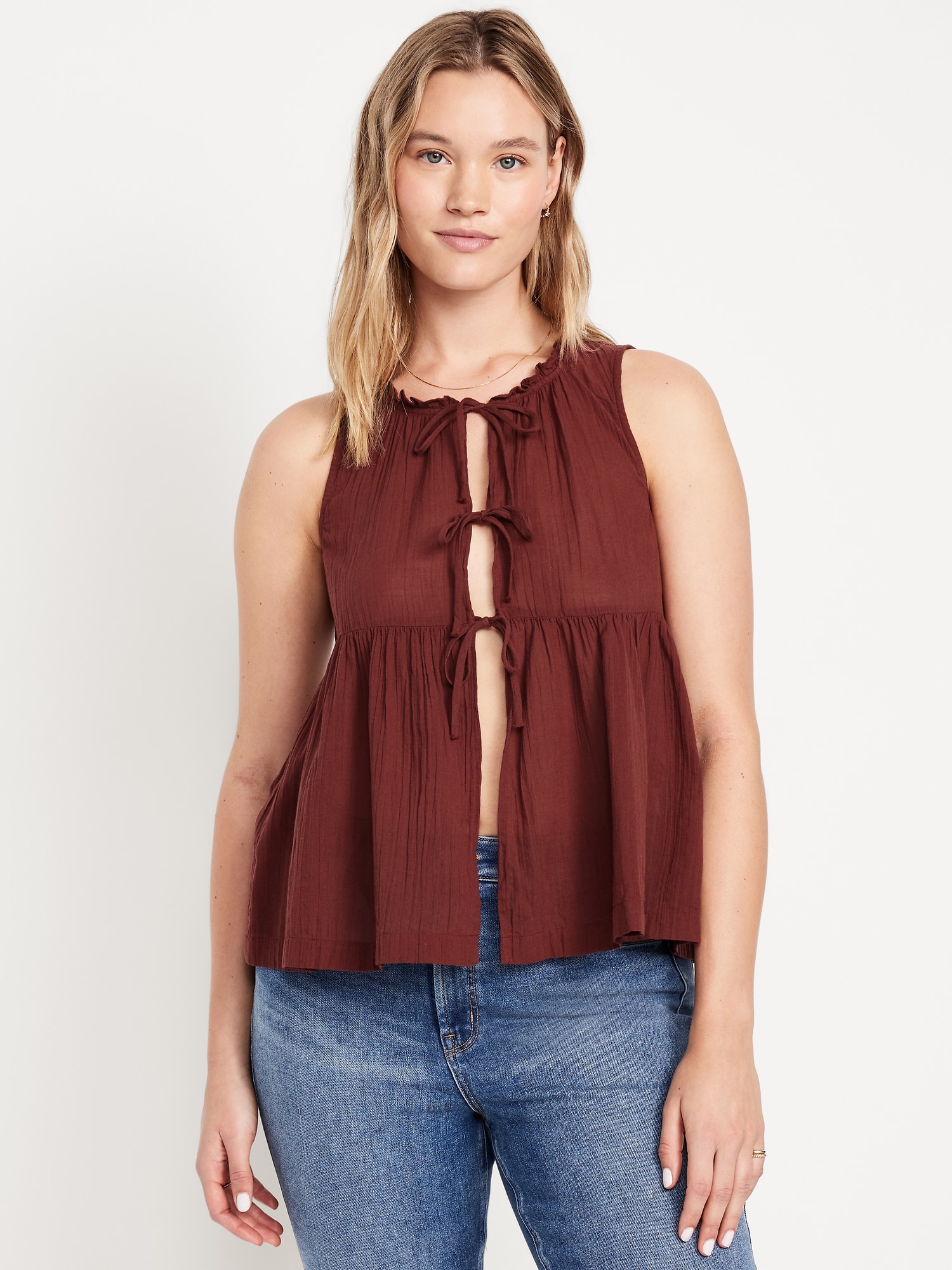 Sleeveless Crinkle Gauze Tie-Front Top: ruffled neck, sleeveless, tie-front detail, seamed empire waist, split center front, #764189