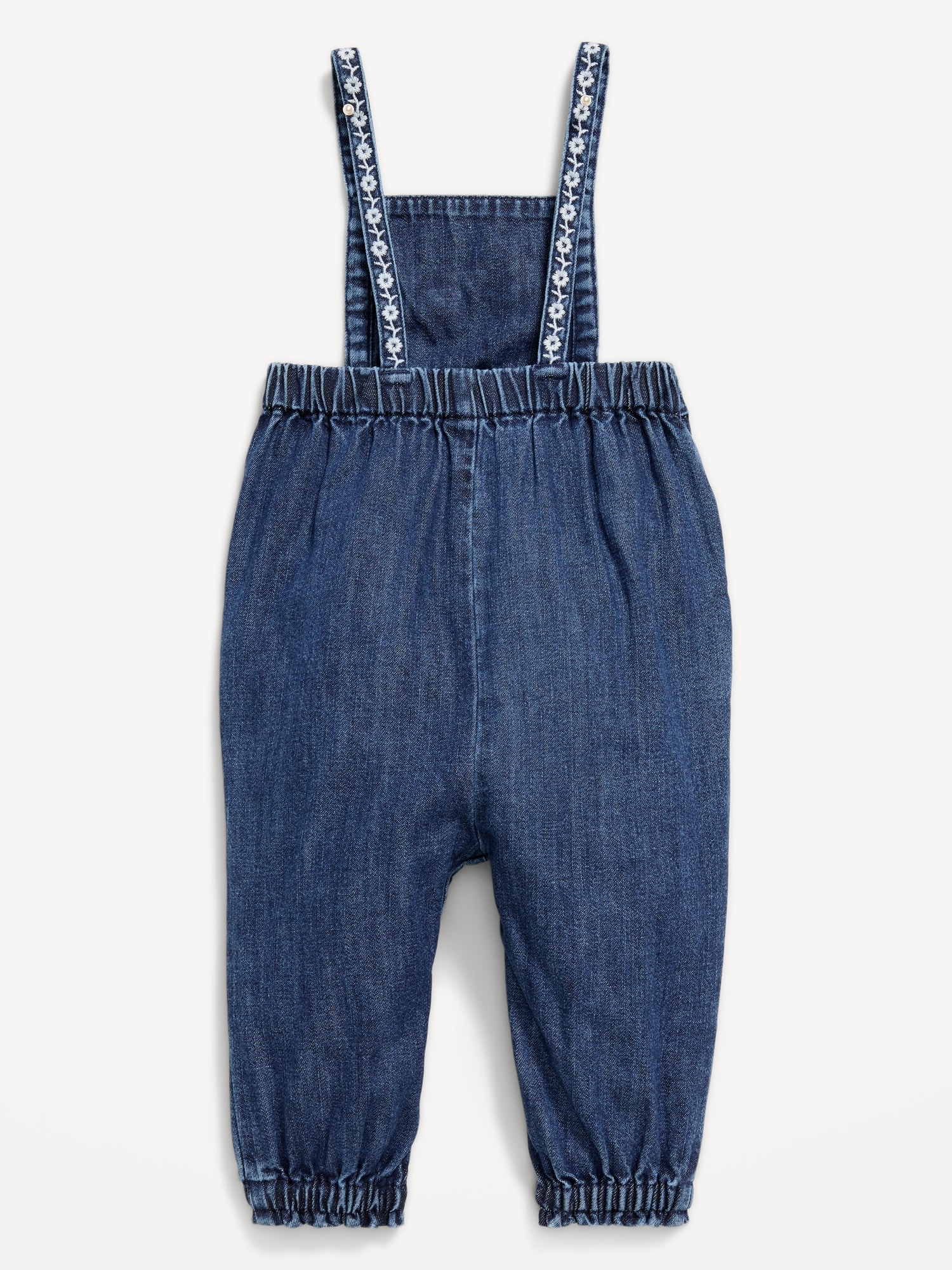 Sleeveless Embroidered Jean Jumpsuit for Baby: square neckline, thin shoulder straps, diagonal on-seam pockets, hidden snaps along inseam, cinched leg cuffs, embroidered pattern, #802255