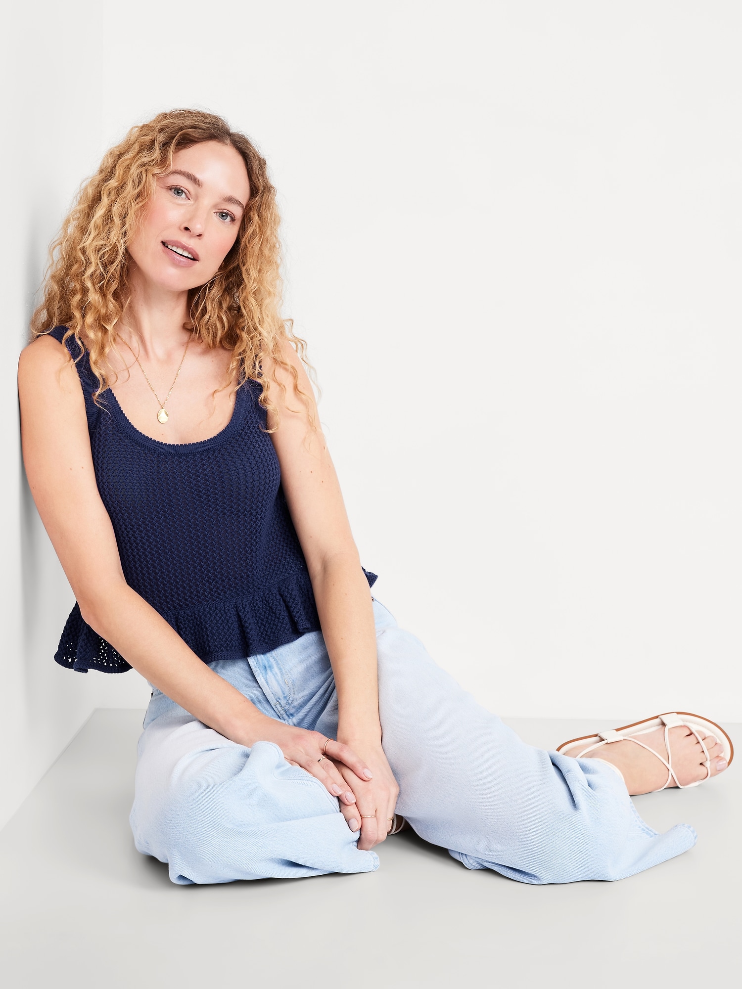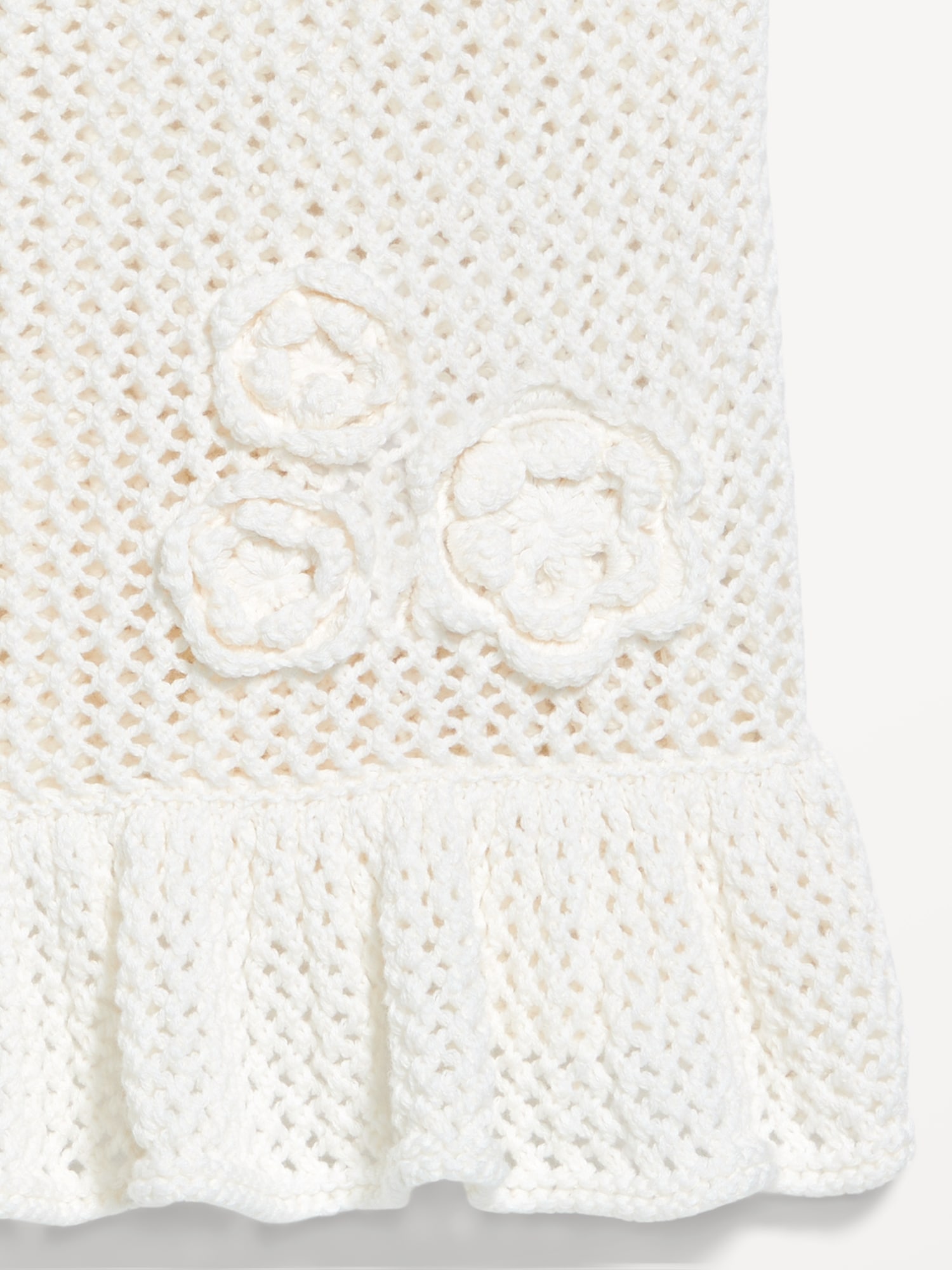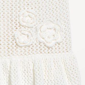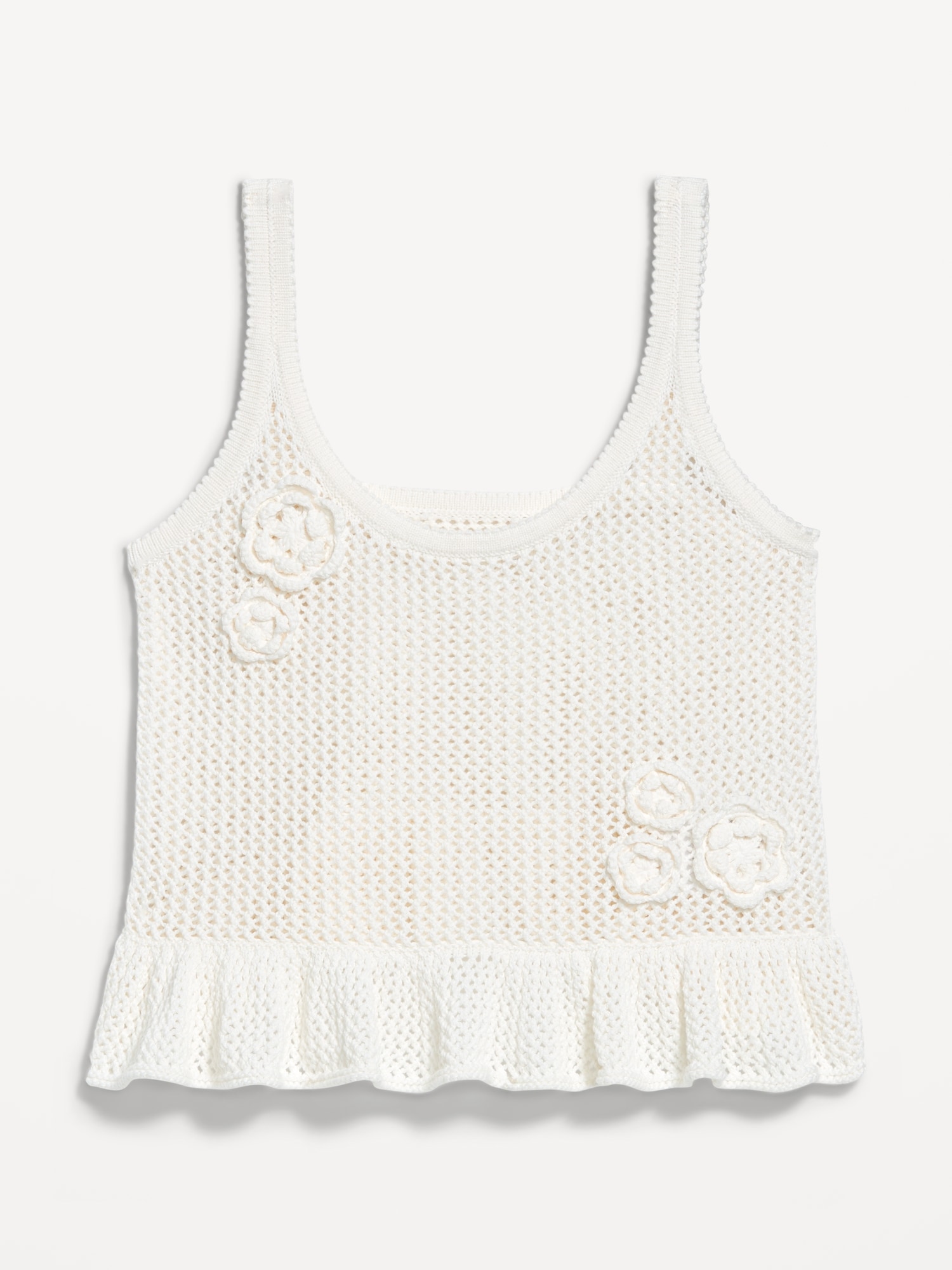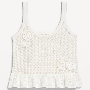 Sleeveless Open-Stitch Peplum Sweater: scoop neck, wide straps, floral appliqué accents, ruffled peplum hem, #761610