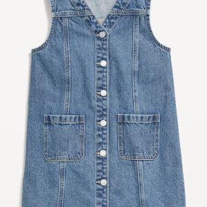 Sleeveless Pocket Jean Dress for Girls: v neck, sleeveless, patch pockets at front, full-length snap-button placket in sizes xs-m, full length regular button placket in sizes l-xxl, #803047